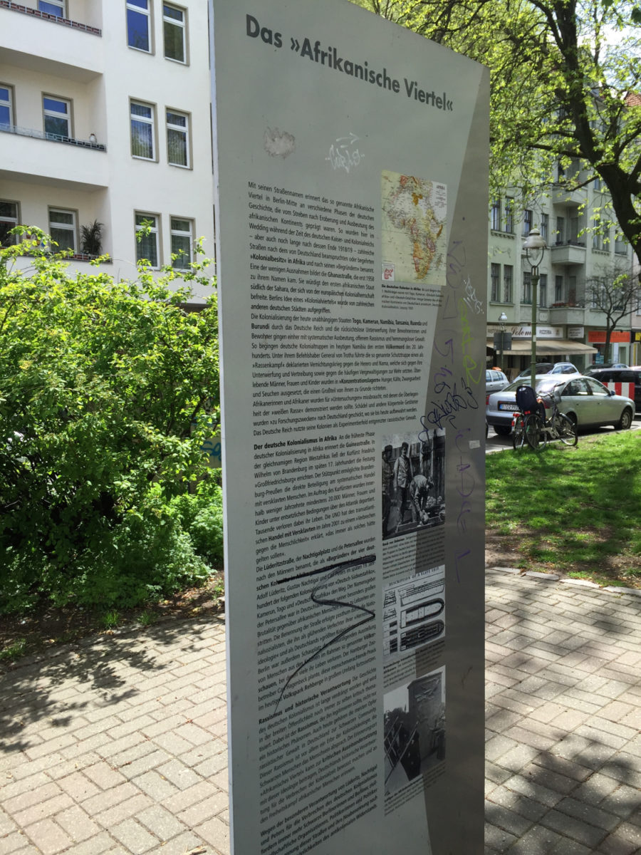 In a corner of the African Quarter sits the only neighborhood artifact that sheds light on the significance of the area’s street names. The artifact is a two-sided information board that presents a brief history of German colonialism and the quarter’s historical development. The board was installed by the Berlin City Council in response to demands made by activists. Following requests for edits to the text, which was initially prepared by city officials, it was decided that the board would present two versions, one on each side. One version would present the text of the City Council and the other that of the African community in Berlin. The African community side has since been vandalized, with references to “German colonies” in Africa blacked out.