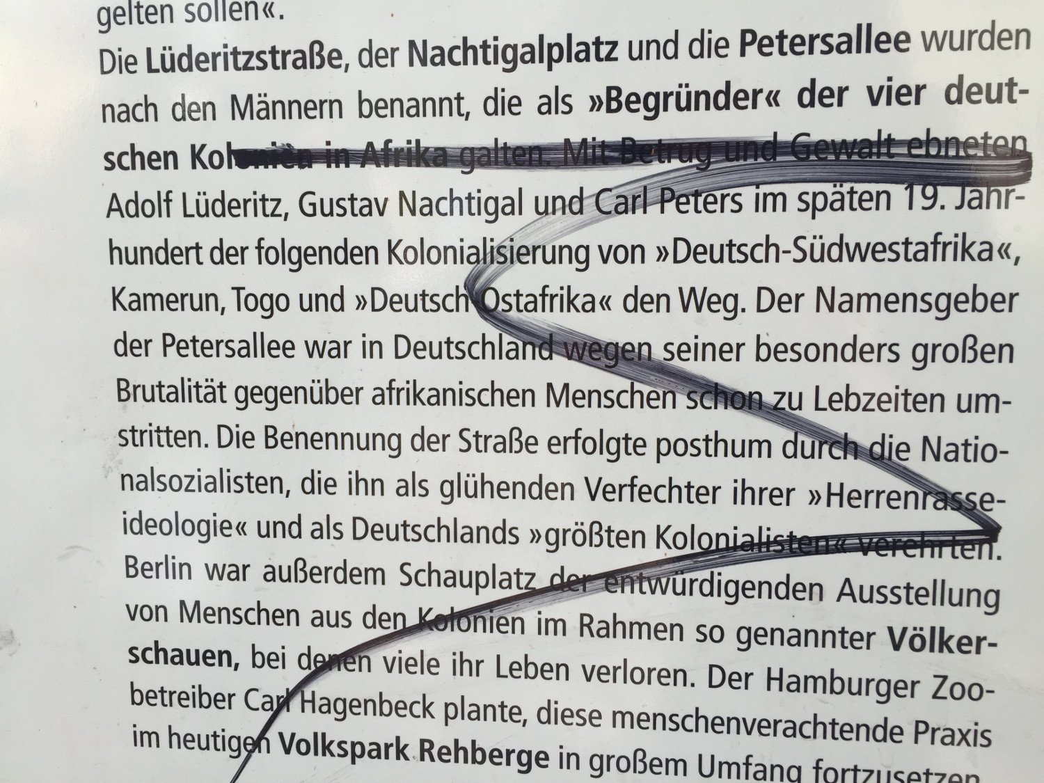African community side of information board in the African Quarter | Vandalism Courtesy of Clapperton C. Mavhunga Mention of German colonies in Africa blackened out | Vandalism Courtesy of Clapperton C. Mavhunga