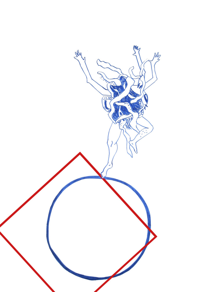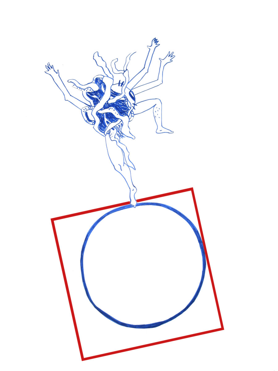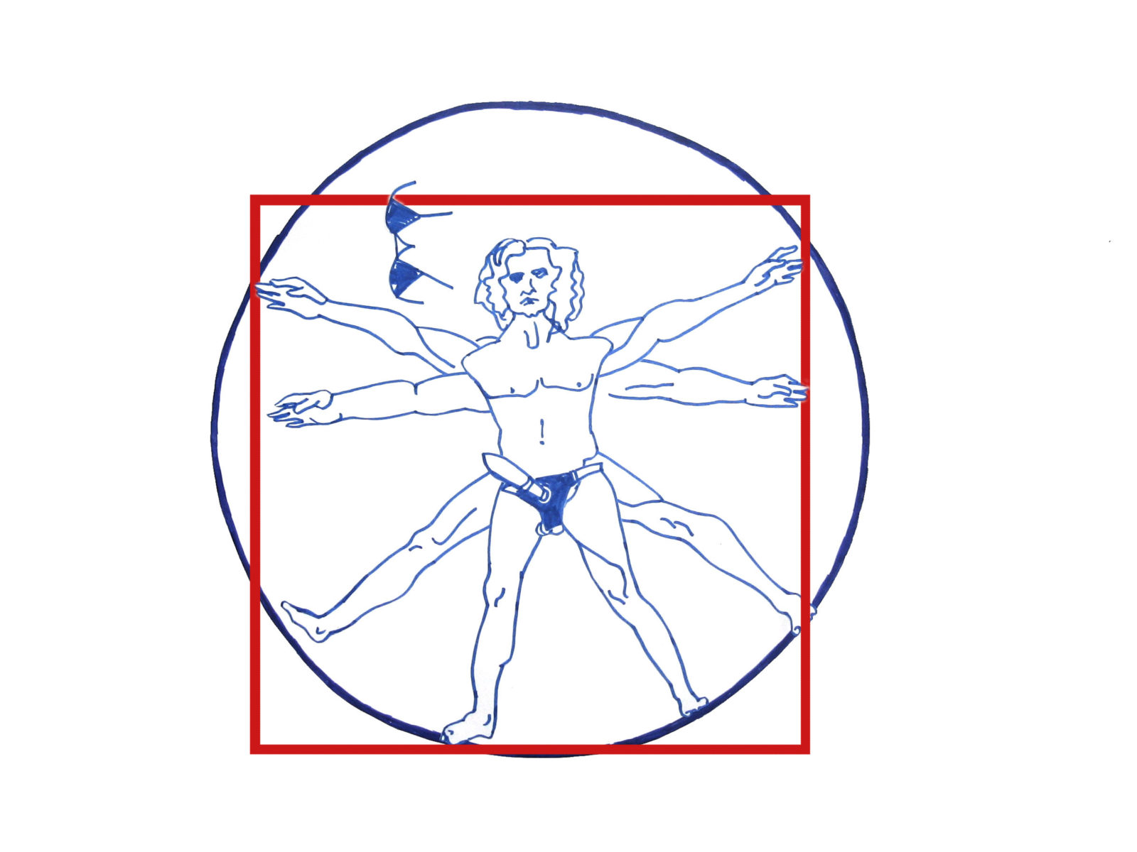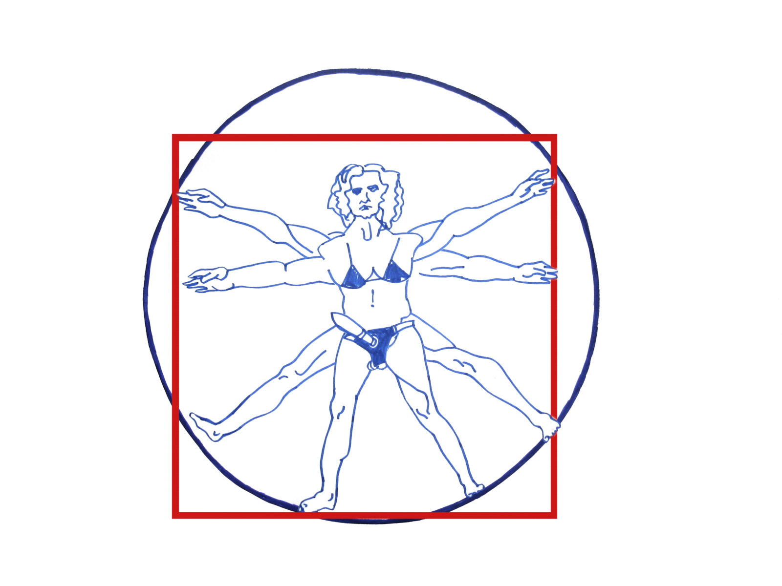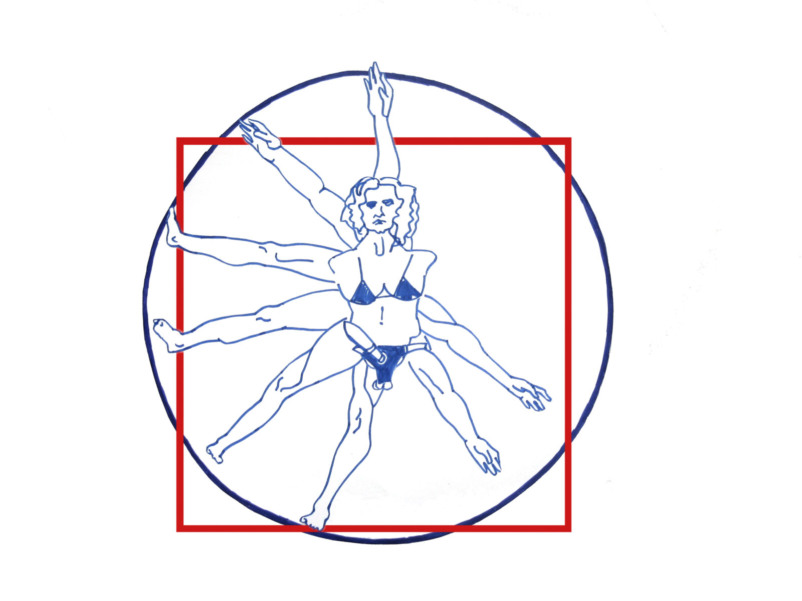 We began with a rainbow of associations typical of a group process. Unable to decide whether Anthropos was simply the villain agent, the “fossil burning man,” as Donna Haraway puts it,1 or if indeed he had some ecological self-awareness, we came to the solution of a simple stop-motion movie that encompasses a historical process. Humanism’s classical Vitruvian Man with his particular proportions to the world is the first picture of Anthropos. With the nuclear strap-on, Anthropos goes through a cyborgish transformation and recoding of gender. His limbs start to dance like the atomic clock, the birth of the Astronaut, who soon after watches the age of United Nations multiculturalism and its reference to the globe. In the final image, the rectangular frame slides away, as a post-human monster crawls on top of the sphere and starts a Shiva-inspired dance—balancing and unbalancing the globe at the same time.
