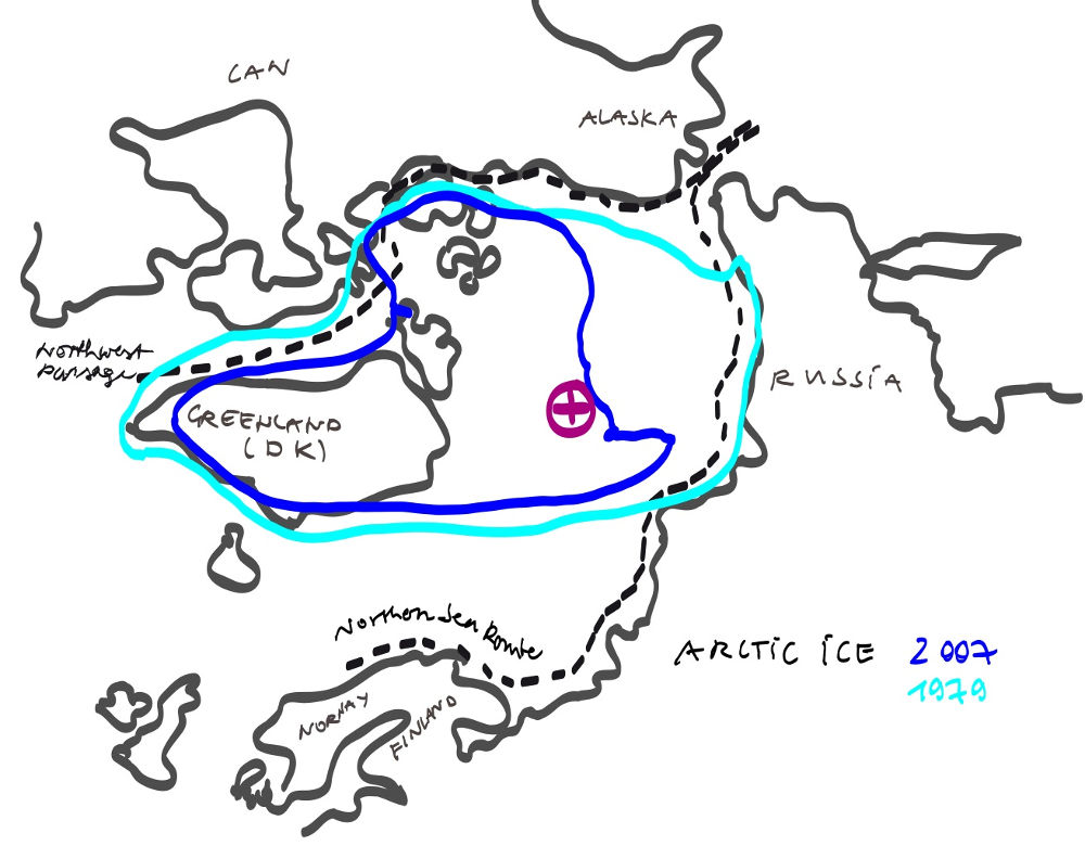 The North Pole is a mark on a map. Its inscribed existence represents no ownership. Yet, this spot in the North is a powerful tool in politics, economy, scientific exploration, and the war of the Anthropocene. In the United Nations Convention on the Law of the Sea (UNCLOS), the North Pole and the surrounding Arctic ice are excluded from any national 200 nautical mile zone, known as an EEZ—exclusive economic zone. With climate change and the melting of Arctic ice, that status is questioned by five states with sea borders in the Arctic: Canada, Denmark (with Greenland and the Faroe Islands), Russia, Norway, and the United States (with Alaska). Each shifts its Arctic borders through remapping the continental shelf of the Arctic in order to expand territorial claims. The economic lures of new sea passages, as well as oil and gas resources, tempted the Kingdom of Denmark to go so far as to include the cartographic North Pole in its claim in December 2014 before the United Nations, with arguments based on histories of the past and visions of a sustainable North for human and nonhuman agencies.1 In 2007, a year of very significant sea ice melt, Russia stepped forward and exercised a military presence in the Arctic by planting a flag on the seafloor below the North Pole.2 A new Cold War is brewing in the North, as the ice melts and the oceans heat—day by day. The sea ice minimum in the summer of 2012 was much smaller even than the 2007 minimum. New records are accelerating.