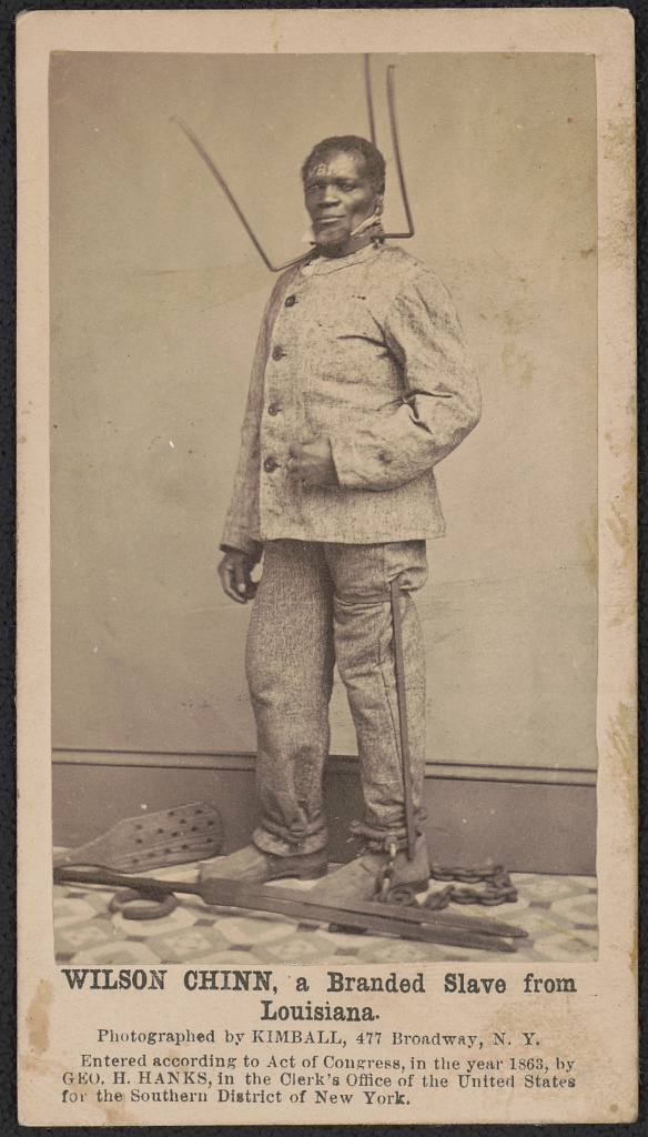 Wilson Chinn, branded with the initials of his owner, Volsey B. Marmillion, wearing a punishment collar and posing with other equipment used to punish enslaved people. Photograph from Library of Congress, public domain