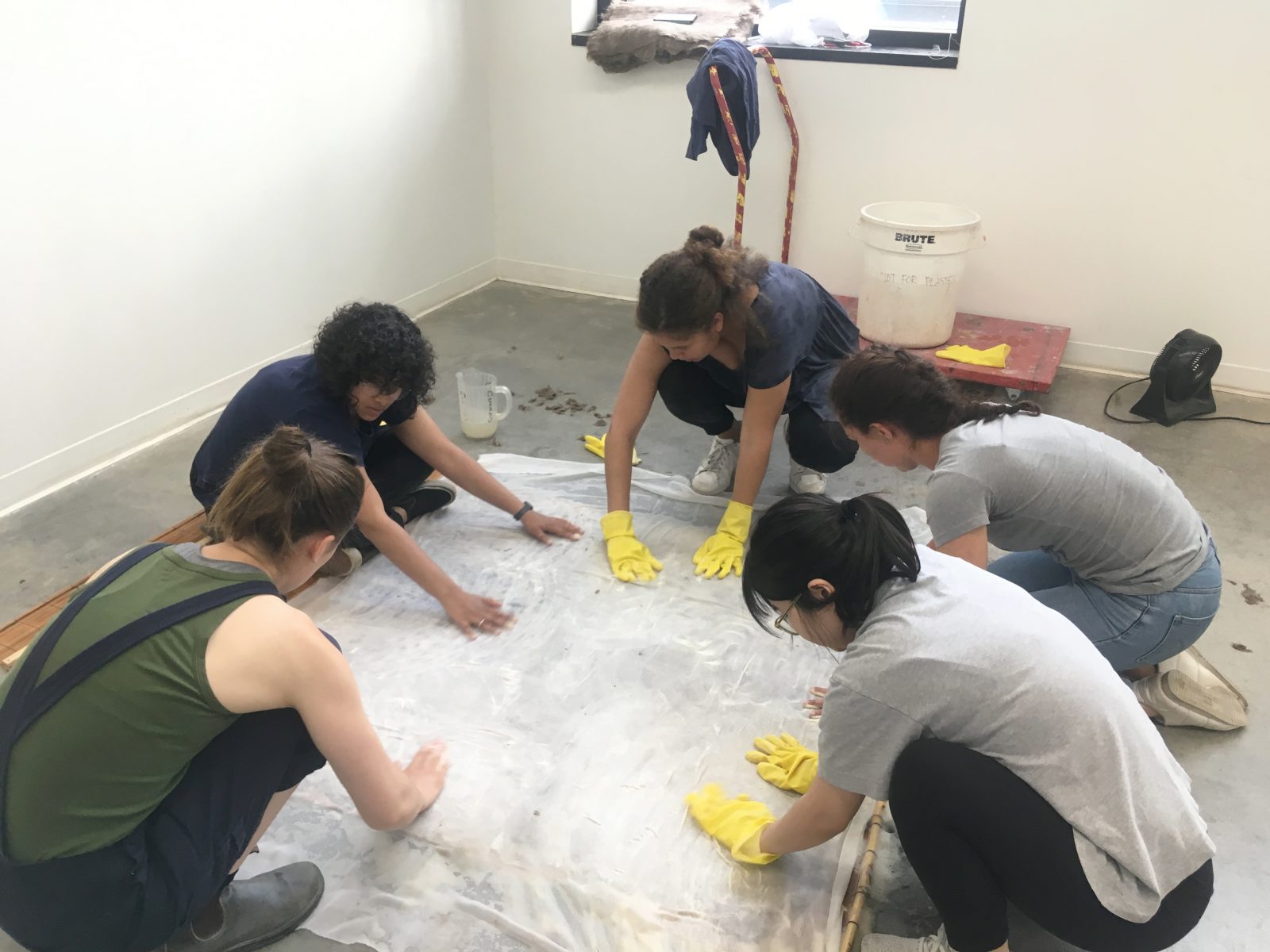 The listening pack takes at its starting point the reality that active listening requires work and support. Artists Erika Terwilliger, Prerna, Harriet Matzdorf, and Monica Haller led a collaborative team effort to make listening mats that invite the listener to sit, stay, linger, and be present where they are. The mats are made of wool, felted using Mississippi river water. Felting large mats of wool is a physical process: on hands and knees, the team worked the wool and river water into a material firm enough to carry something that could orient and transport people. As the water evaporated from the finished material, fine sediment and bits of the river remained embedded in its pores.
