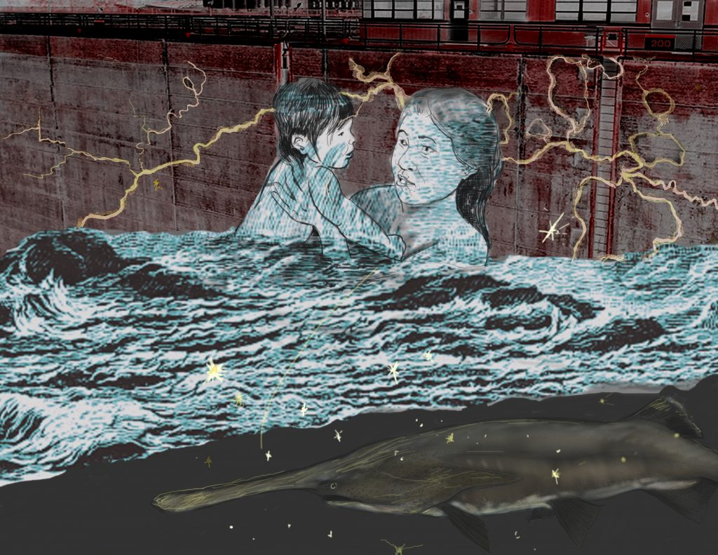 Even the anamniotes, amniotes, and wombless among us have river and mothering stories to tell. The endangered paddle-fish (Polyodon spathula)—or in Ojibwe Mayagi-name (pronounced nuh-may), meaning “strange sturgeon”—indigenous species in the upper Mississippi are vulnerable in part due to blocked passage up river to the shallow water locations they favor for egg spawning and breeding — blocked by the walls comprising Lock and Dam No 1. The closing down and blocking of a continuation in a 65 million year continuous line of life for this species, localizes the story of the Anthropocene in the deep time of the American paddle-fish. The species is popularly named the “primitive fish,”, as it has one of the oldest fossil records of animal life, dating c. 300-400 million years ago, 50 million years before the dinosaurs. It is artist Molly Avery who tells us this fish story, through a fictional entanglement between fish and human mother: