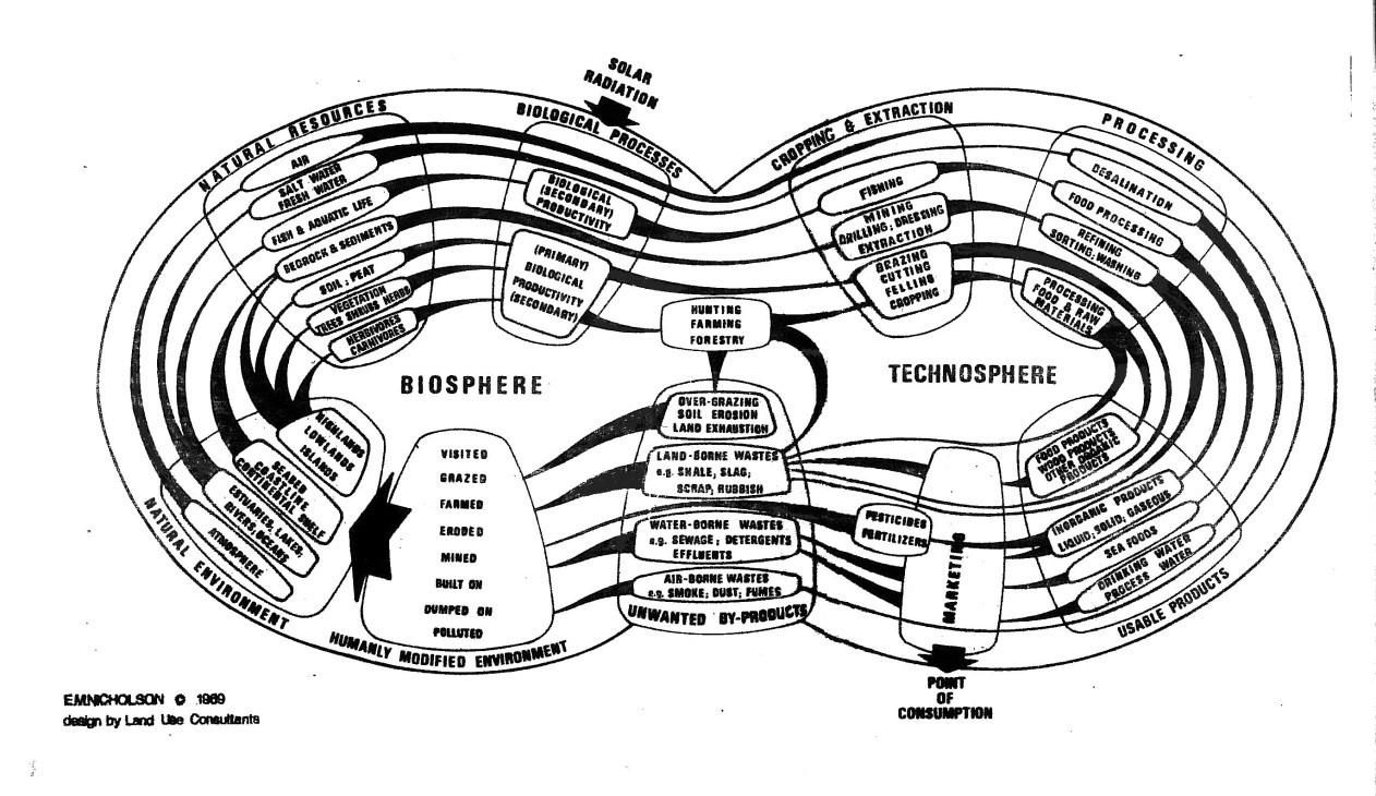 “Diagram of the Biosphere and the Technosphere” | Land Use Consultants, LUC, for Edward Max Nicholson, 1969 Courtesy of the Linnean Society Archives, London