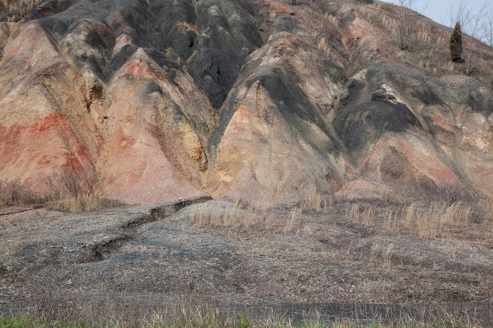 But perhaps our mounds are no less enigmatic. After all, who, really, can account for the otherworldly, colorful mound sitting across the river just south of the Gateway Arch? That reliable sources tell me it is a heap of residue left over after the cleaning of coal does not explain the range of reds, browns, blues, and yellows that marble its surface—let alone begin to answer what it is doing in the floodable part of the floodplain. I have revisited this mound dozens of times, and each visit reveals a new silhouette, a new stratum, a new rent carved by the most recent rain or flood.