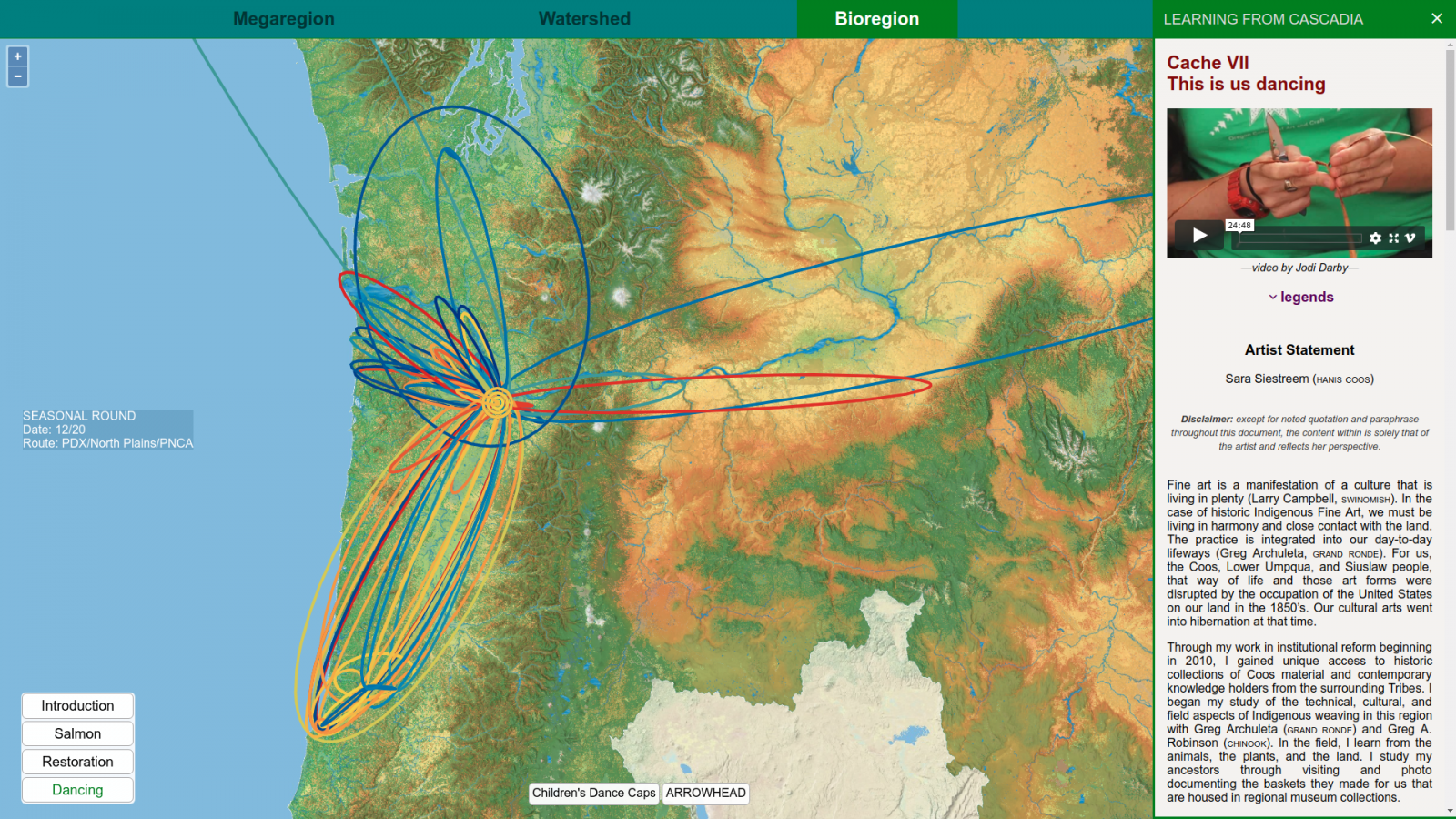 Living in the United States under rapidly decaying political conditions, it seemed essential to find, not just “principles of hope” (we burned through those with Obama), but instead, tangible processes of socio-environmental change that involve broad publics and create new governance routines at regional scale. Only one place in the US seemed to fit that bill: the Pacific Northwest, including Oregon, Washington, and British Columbia. There, generations of inhabitants had absorbed the lessons of countercultural figures such as Gary Snyder and Peter Berg, who put the term “bioregionalism” into circulation in the late 1970s. Bioregionalists insist on locally identifiable watersheds as the most appropriate units of governance. Some extend beyond the watershed model to larger territories, including the one called Cascadia: a more-or-less coherent ecozone transgressing the boundaries of all the existing political units named above. Back in Illinois, where I live, there’s no comparable movement, nor any such audacious attempt to redraw existing borders. So I set out on a new cartography project in cahoots with a Portland-based artist and curator, Mack McFarland. Drawing our inspiration from dozens of partners and collaborators, we called the project Learning from Cascadia.