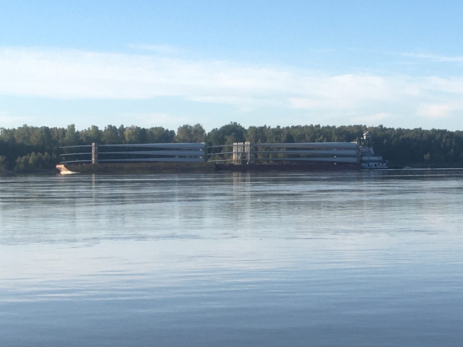 It was the partial achievement of this vision through which we travelled. The submerged wing dams we dodged as we canoed the outer edges of the river acted as sentinels to the past’s logistical ambitions, their chicane-like structure maintaining a concentrated flow and ensuring sediment incessantly scours the riverbed. Deepened by the river’s work, the passage of towboats and their improbably large retinues of barges is assured. On our stretch, we saw wind turbine blades heading to the Midwest and refinery components, like a floating chemistry set, headed to Texas via the Gulf Intracoastal waterway. Though deceptively wild at points, the intermittent traffic reminded us that this was less a river than an industrial archaeology.