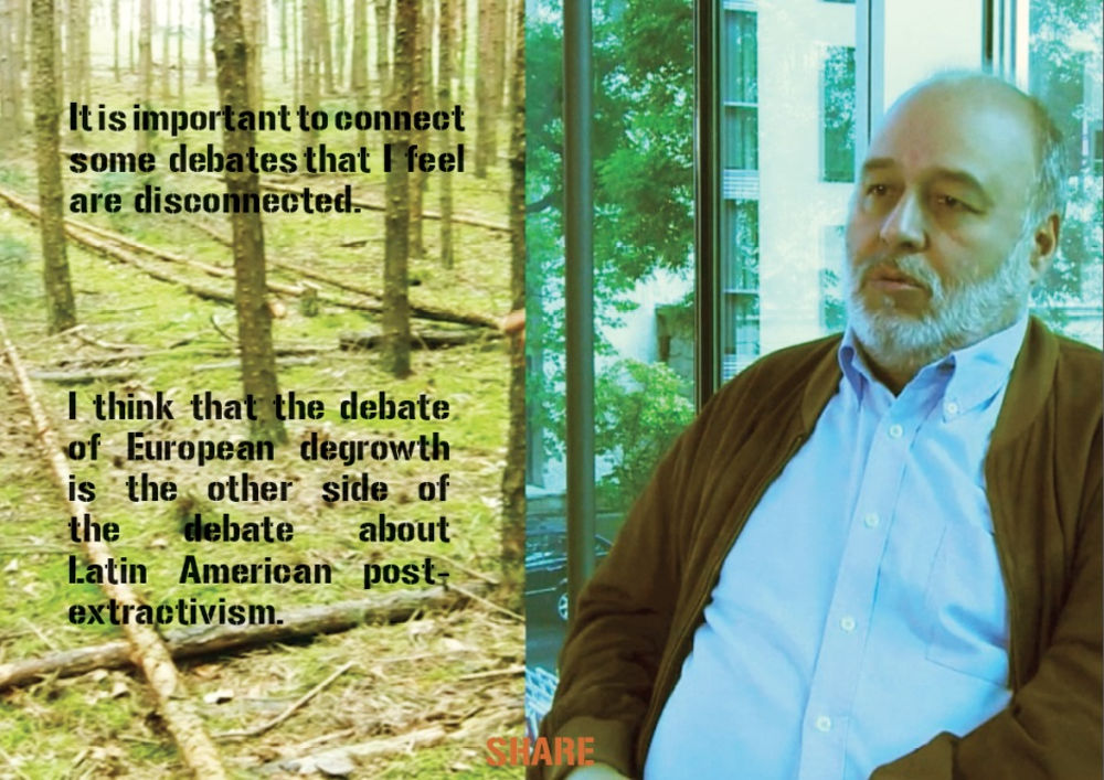 The participative exhibition is a collaboration between Stella Veciana and Dan Norton. When it was first presented at the Center for Development Research in Bonn, it showed an interactive video-interface projected onto a kentia palm tree and a series of posters with quotes from interviewed experts of the so-called “global North” and “global South.” The interactive interface contains a growing archive of video interviews that connect specialist knowledge from a continuous series of transdisciplinary conferences. The key questions of the interviews address themes such as present resource policies, their impact on environmental and human rights, and possible ecologically friendly and good-governance alternatives to extractive and neo-extractive development models. Other interviews discuss topics relating to sustainability research and Buen Vivir. The interactive software allows extended video interviews to be analyzed and classified by theme and topic, and then these topics are categorized using key words in a drop-down menu, making each interview sequence directly accessible. This allows all interview comments that have been made regarding, for example, the key words Buen Vivir to be easily found, selected, and discussed on the site.