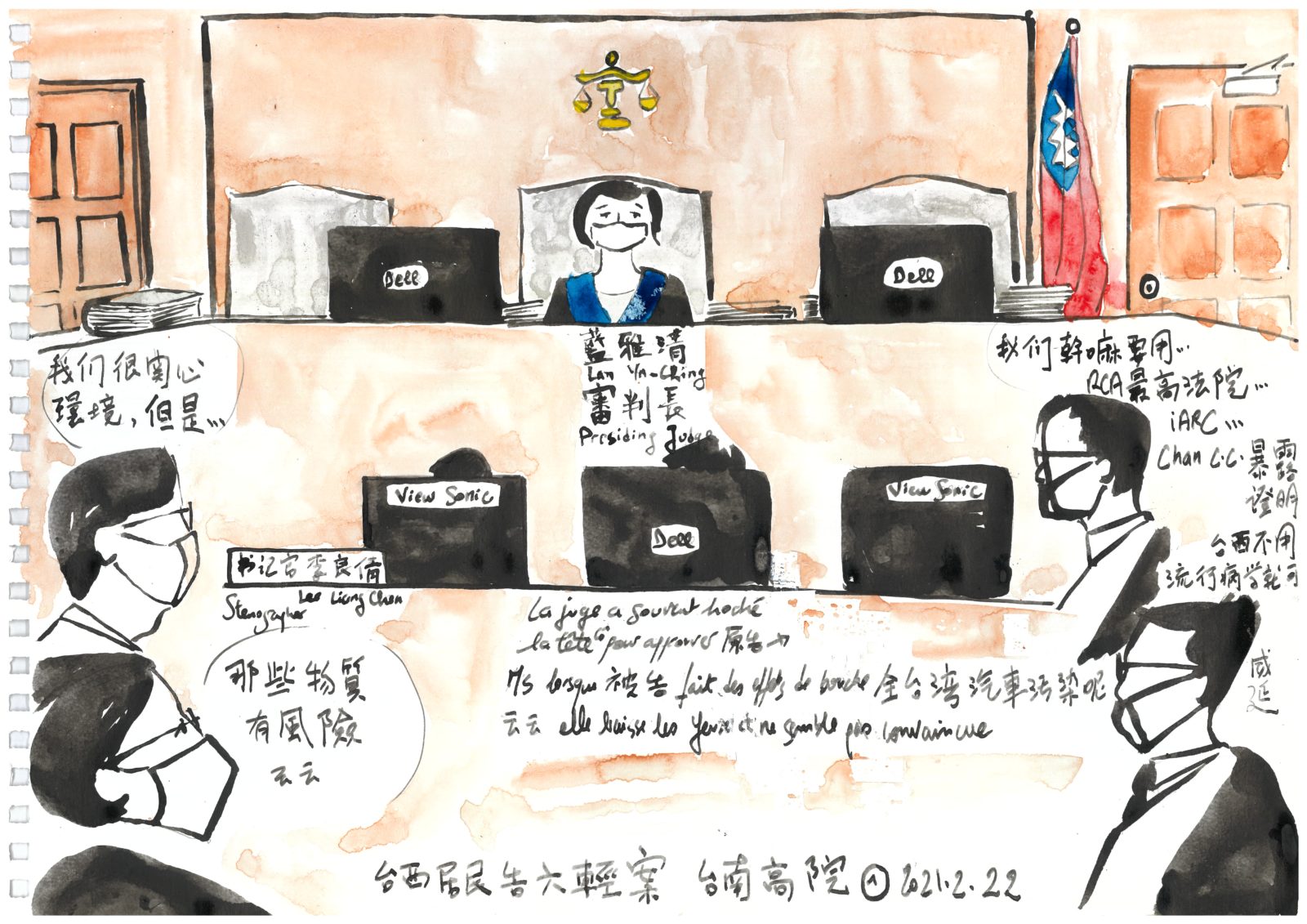 Yunlin Residents vs Formosa Plastics Group, Tainan High Court, February 23, 2021. This courtroom sketch by sociologist Paul Jobin is from an ongoing lawsuit by Yunlin County residents against the Formosa Plastics Group. The drawing is part of a series that captures the dynamics within the courtroom over the past five years. Archived as a form of “civic data”, it can be used to inspire litigation in other places. Sketch by Paul Jobin