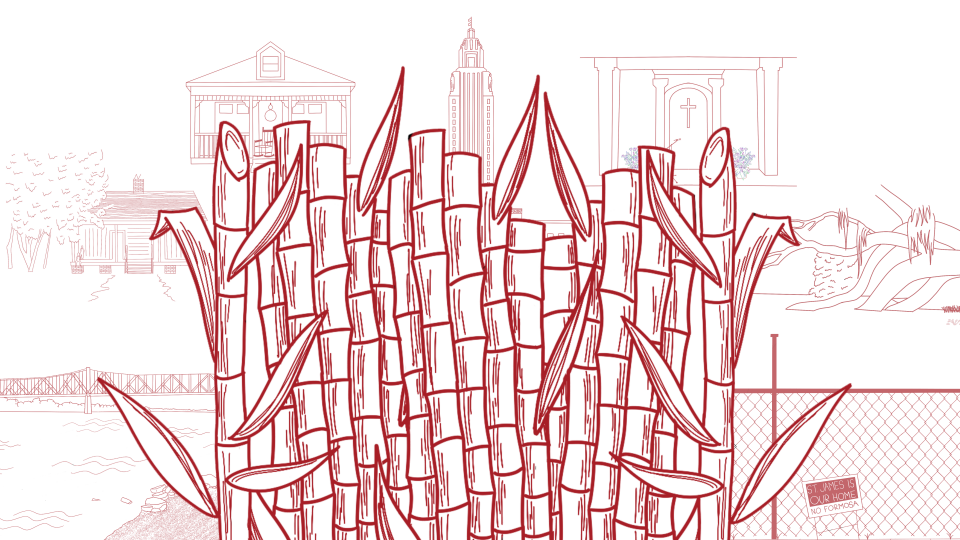 Illustration by Kora Fortun for the digital exhibition Sugar Plantations, Chemical Plants, COVID-19. Stops include the Whitney Plantation (focused on the lives and perspectives of enslaved people in Louisiana), the Fee-Fo-Lay Cafe (where community knowledge is shared and the region’s storytelling traditions are preserved), and places where community members are organizing resistance to the building of yet another petrochemical facility in the area, on a former plantation site. Illustration by Kora Fortun (2020)