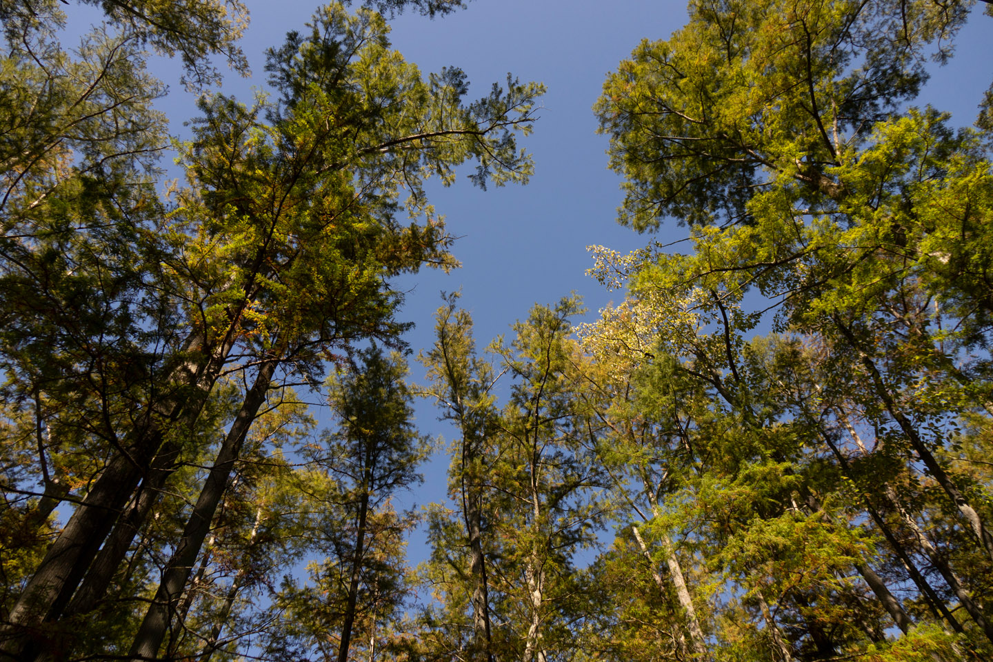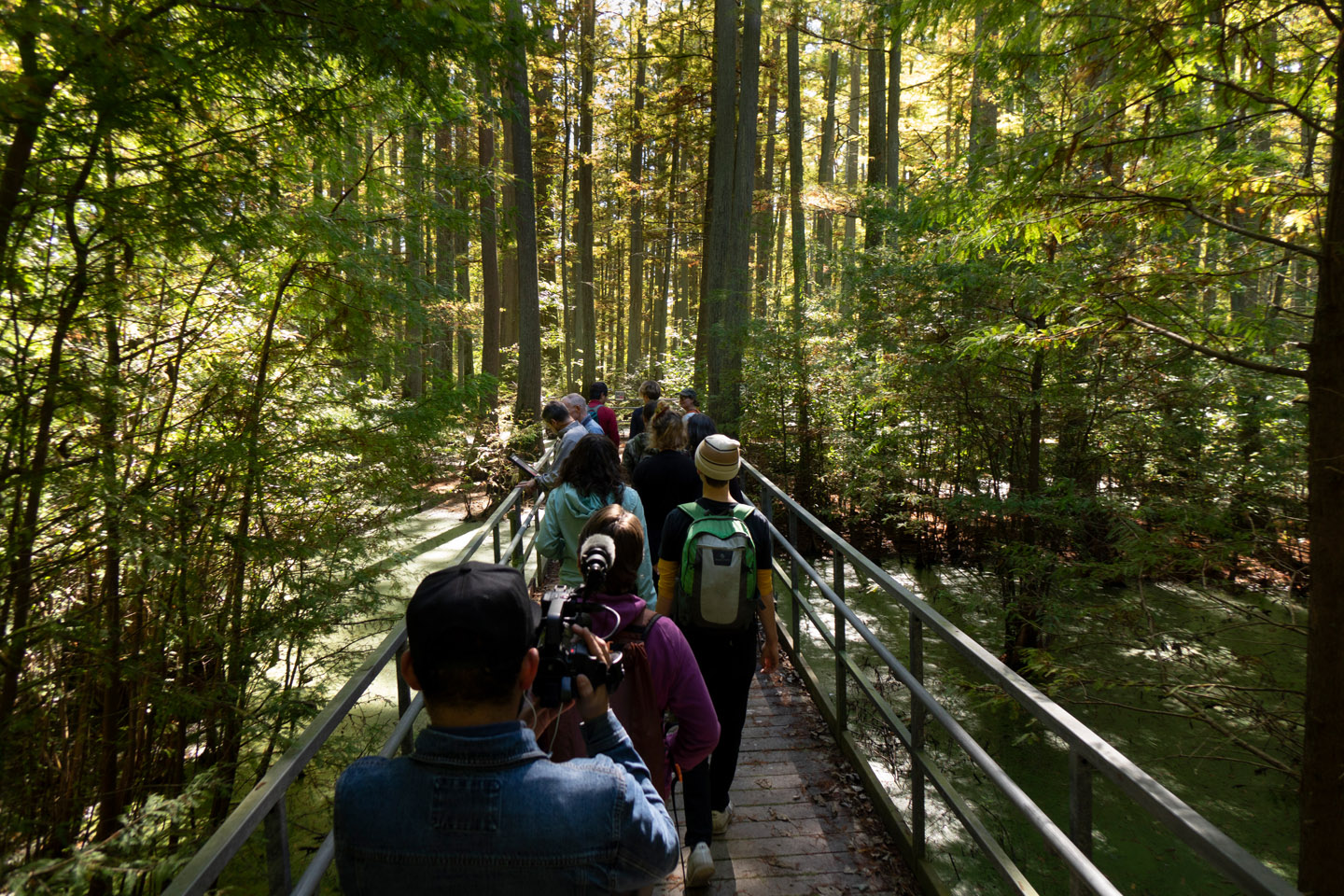 The Main Brothers dug a long ditch with lateral channels to float hardwood logs to their sawmill in Karnak. Large agricultural landowners pressed for more improvements, leading to the dredging of the Post Creek Cutoff, which reroutes most of the Cache River through an increasingly eroded gully down into the Ohio. In the 1950s a Diversion Channel was installed at the river’s end, to shift the remaining trickle of water from the Ohio to the Mississippi. And the big farms just kept on growing. Local resident Max Hutchison woke up in the late 1970s to realize that the forests and pools he loved were disappearing before his eyes, dried by ditches and swallowed by soybeans. Our first stop on the tour was the breathtakingly beautiful Heron Pond, saved along with an emerald string of cypress-tupelo environments by grassroots and government activists in the 1980’s and 90’s.