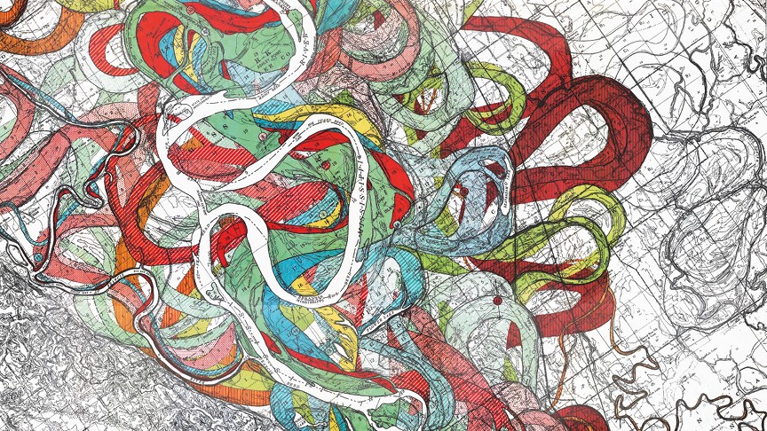 The 1944 Fisk maps of the Lower Mississippi River that adorned the program cover for the Anthropocene River Campus: The Human Delta are immediately captivating. It’s not just the light greens, oranges, yellows, pinks, and reds intersecting and swirling across the page, or the interplay of curves tracing the meanders of the river against the underlying cartographic grid; the real power of these drawings, I believe, is in their fantastical nature. They speak to an unimaginable world in which a river runs rampant, sweeping to and fro across the landscape, riverbanks and watercourse shifting by miles even within the lifespan of a single human.