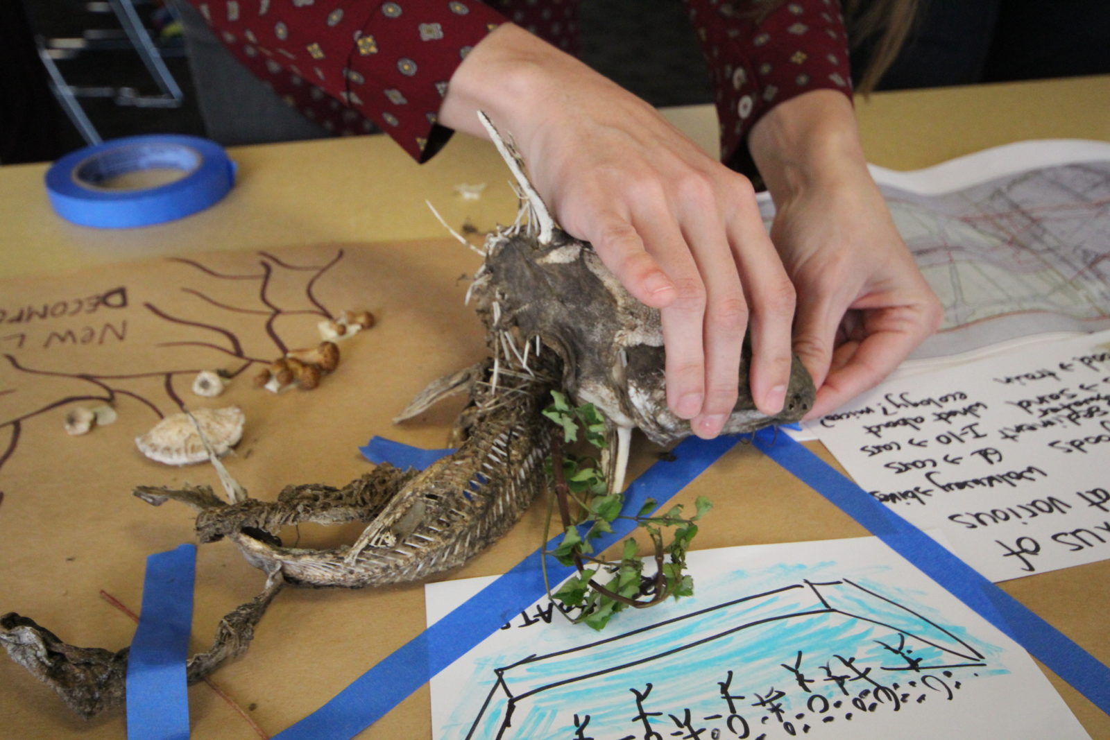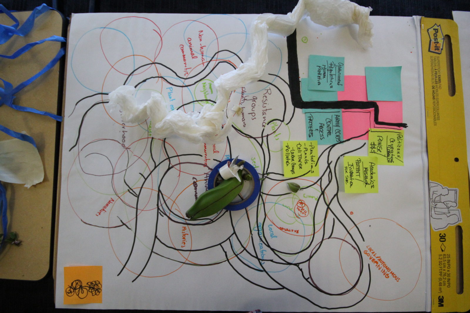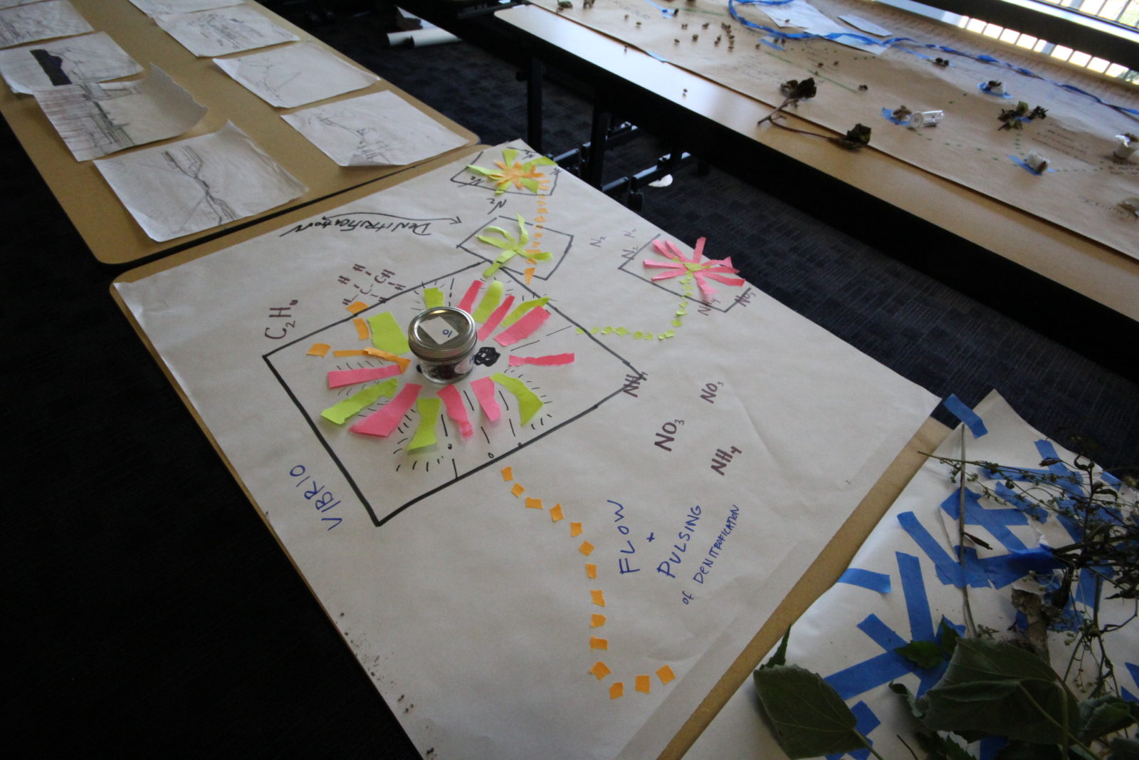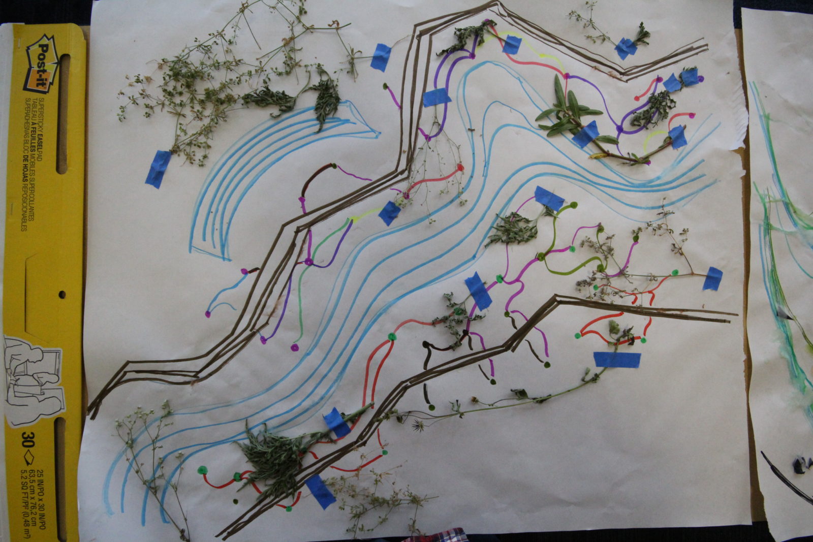 In the first activity, all participants array drawings, artifacts, biological samples, and other materials from Days 1 and 2 on giant piece of paper to articulate relationships between different phenomena, scales, and systems.