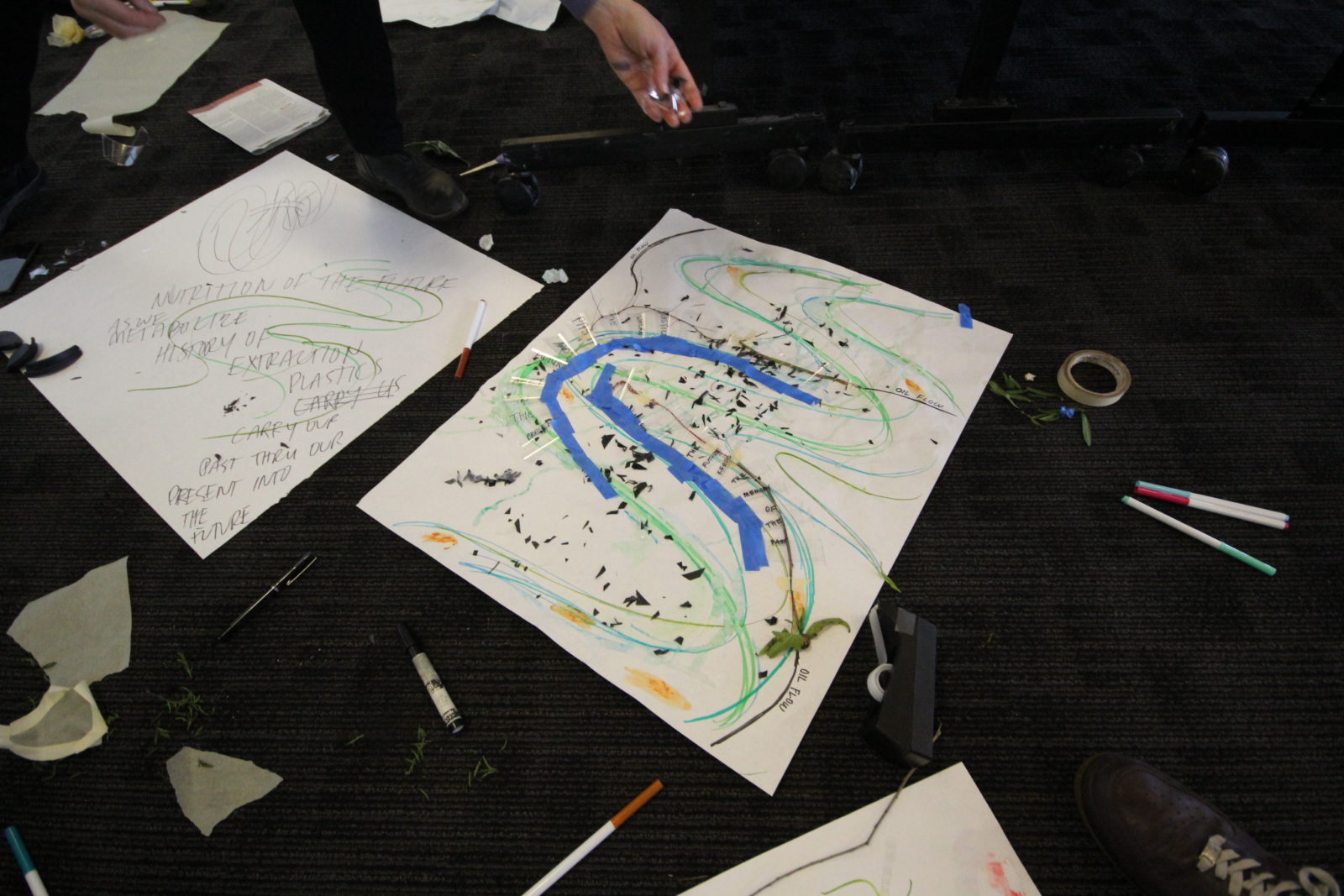 To wrap up, we organize ourselves around sets of ideas that are visible on the BIG drawing, and work in smaller groups to create new drawings representing possible futures for the river and the delta. With less than an hour to create our drawings, we use materials already at hand. We seek to communicate underlying principles and organizational structures rather than attempting to imagine what each possible future will look like. We tear open plastic cups and use wedges of plastic to represent extraction and toxicity as well as the arpent lines of plantations. We simulate a healthy wetland environment using paper, tape, and plants collected at the Spillway. We use tape to literally create a mesh network with no beginning and with no end.