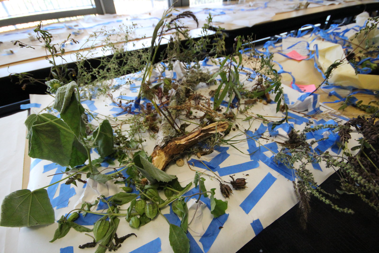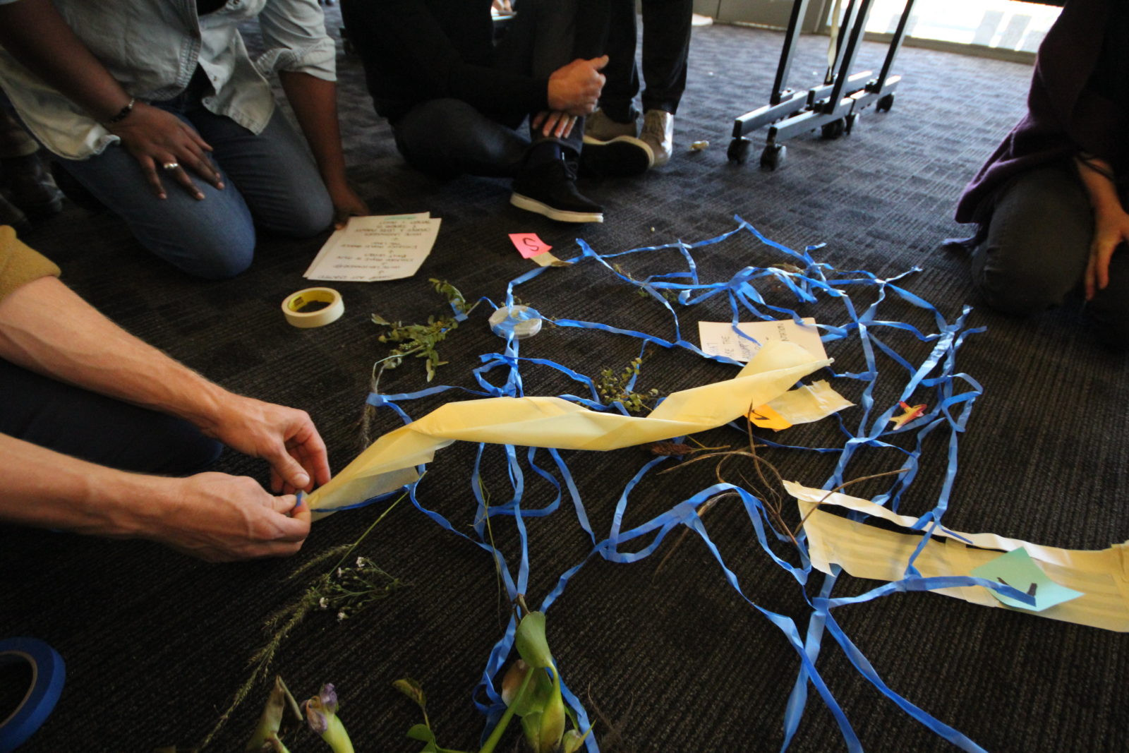 Each of the drawings and visual artifacts we create is a drawing “of” something rather than “about” something. If you tug on the web of blue tape one group creates, for example, every other part of the network moves too. The drawing embodies the principles of interconnectedness and mutual dependency we are seeking to represent. The forested wetland another group creates is a model of a new kind of ecosystem where humans are not the prime actors—the three-dimensional drawing contains within it the very sediments and seeds that would be necessary to seed such an ecosystem. And we discover new organizational and representational possibilities along the way. The segments of blue tape used to bind plants to paper form their own pattern, offering additional representational opportunities.