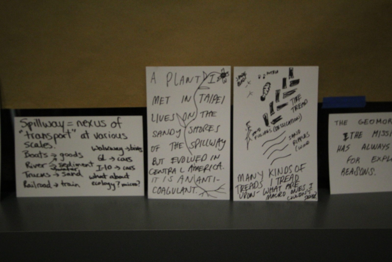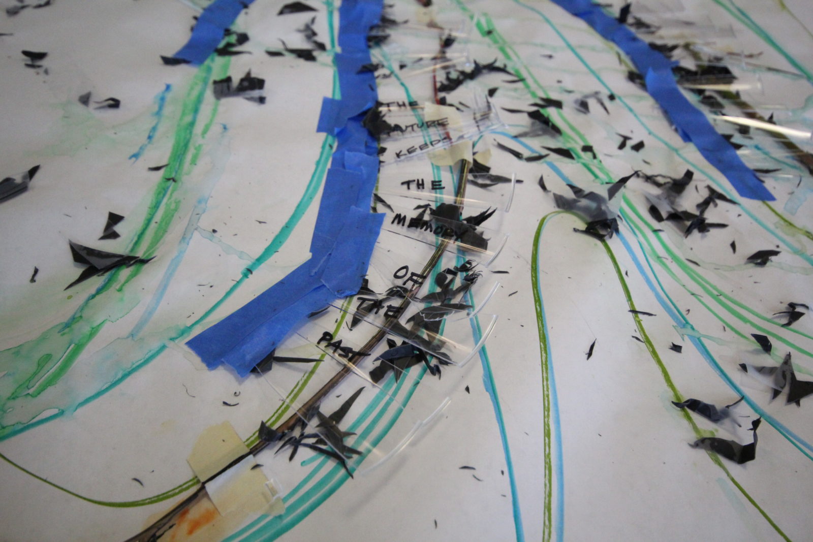 Drawing as an exploratory, co-creative process is one way can come together to share different forms of knowledge and to develop and communicate ideas formed out of diverse perspectives. With limited time and limited materials, we end up relying on observation and listening, synchronizing the imaginations and hands of many co-creators, and the serendipity of materials. The process of making each drawing relies on our ability to build trust and understanding between co-creators and to find ways to work together. It asks us to engage both the physical properties and the symbolic value of tape, water, plant cuttings, mold, paper, cardboard, plastic, tar balls, words, and markings. With these humble materials, we can help each other draw connections between local conditions and global trade. We can make tangible interdependencies between our respective forms of knowledge, between humans and other species, and between the our past, present, and future. And we can both make visible and reimagine our own disciplinary practices even as we reimagine the myriad flows of water, soils, life, capital, and toxins that shape our existence, often through, over, under, and around the hard lines we’ve drawn in the landscape in order to control the Mississippi and its delta.