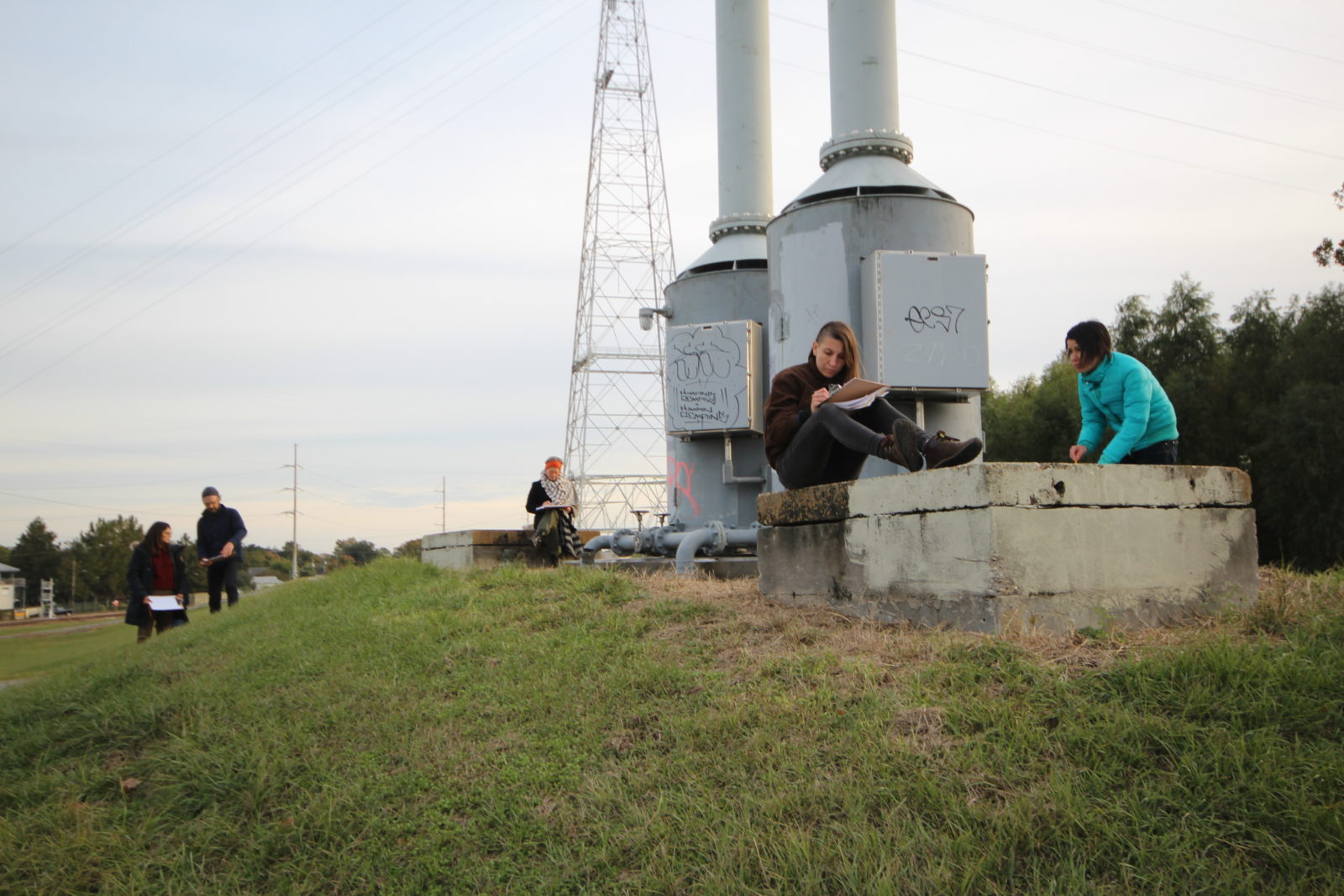 Later in the afternoon, we climb onboard a bus and head upriver and into the Leonidas neighborhood to visit New Orleans’s drinking water intake—this connection to the Mississippi is one of the ways in which New Orleanians are dependent on the current path of the river. We create sectional drawings documenting the boundary between city and river, which is an earthen levee that keeps the Mississippi from inundating low-lying neighborhoods. We also trace the pipe that carries water from the river over the levee and towards the city’s water purification plant, which supplies drinking water to the city. By using our bodies to measure changes in distance and elevation and using sectional drawings to document those findings, we become more attuned to the scale of infrastructure and also the flows that cross the boundary between city and river.