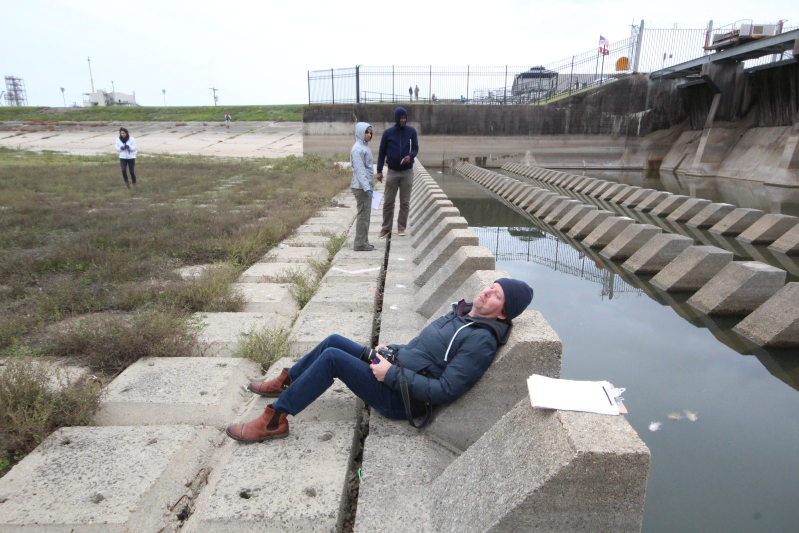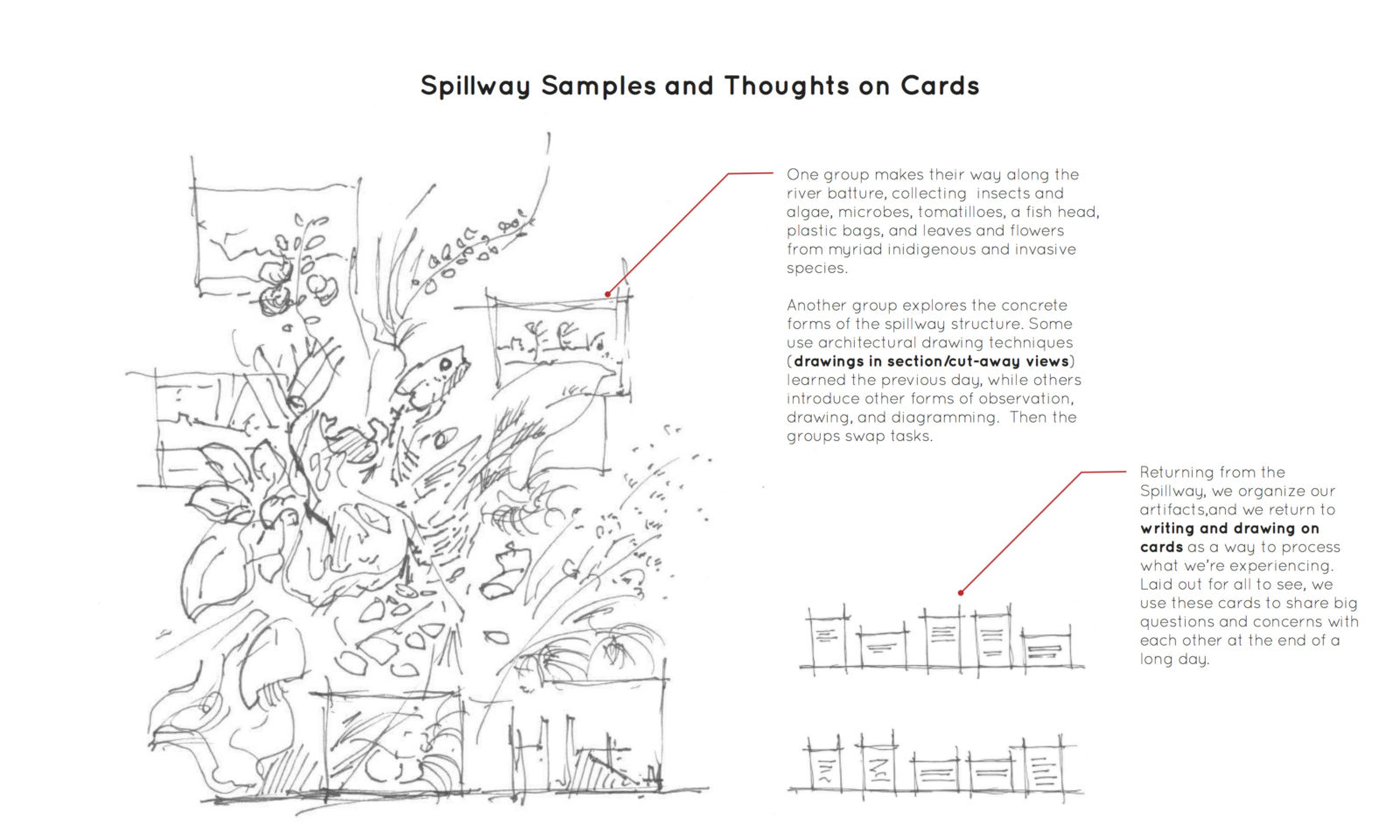 On Day 2, we take a bus out to the Bonnet Carré Spillway, a massive flood control structure located upriver of New Orleans in St. Charles Parish. Our interest is in the ways in which engineered forms both restrict and permit flow, and in examining relationships along and across the boundary formed by river levees and the spillway structure. We continue to draw using clipboards and markers, but also bring with us jars and bags in which to collect artifacts for the next day’s drawings.