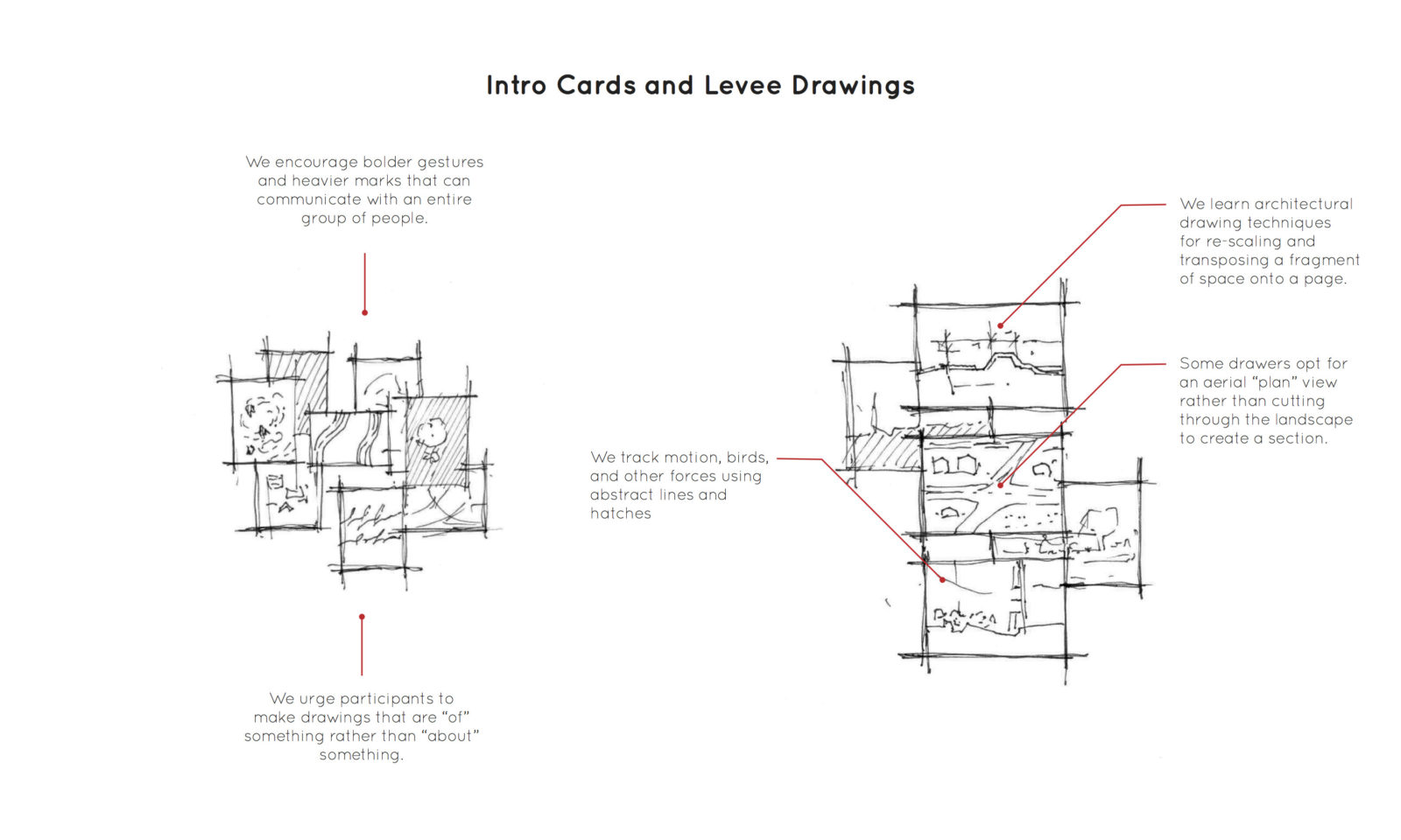 We chose to build the seminar around the practice of drawing, with the goal of building from small individual drawings to large wall-sized compositions co-created by seminar participants. We asked: how can drawing support different modes of exploration and learning? How can drawing enrich dialogue and support multi-disciplinary practice? And how can drawing support the imagining of new futures for the Mississippi?