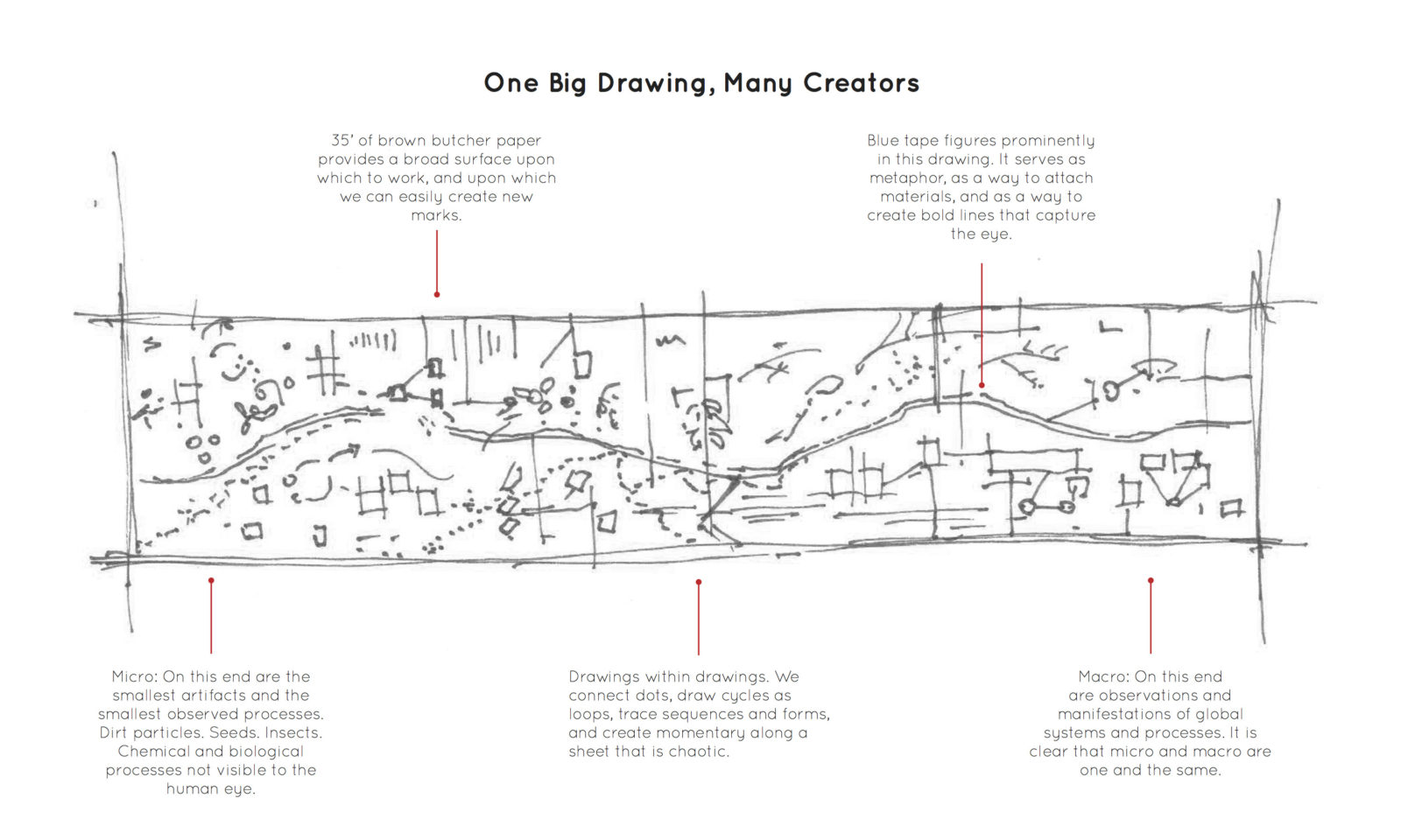 We organize Day 3 around co-creating large drawings. Dialog, questioning, and ideation become tangible through the arranging of artifacts and through markmaking. Working together in this way requires coming to agreement on structure and principles, form and technique. How will we use this big sheet of paper? What is top, what is bottom? How do we reinterpret materials, draw connections, or add new ideas?