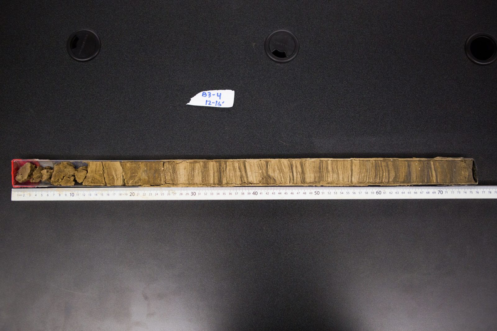 Core Sample B3-4 12-16. Photo by Sarrah Danziger Examining a core, LSU Center for River Studies. Photo by Sarrah Danziger