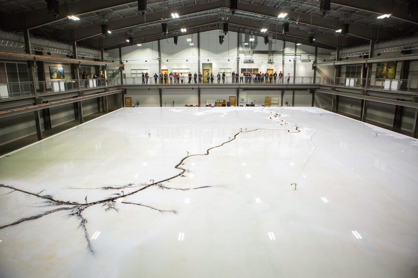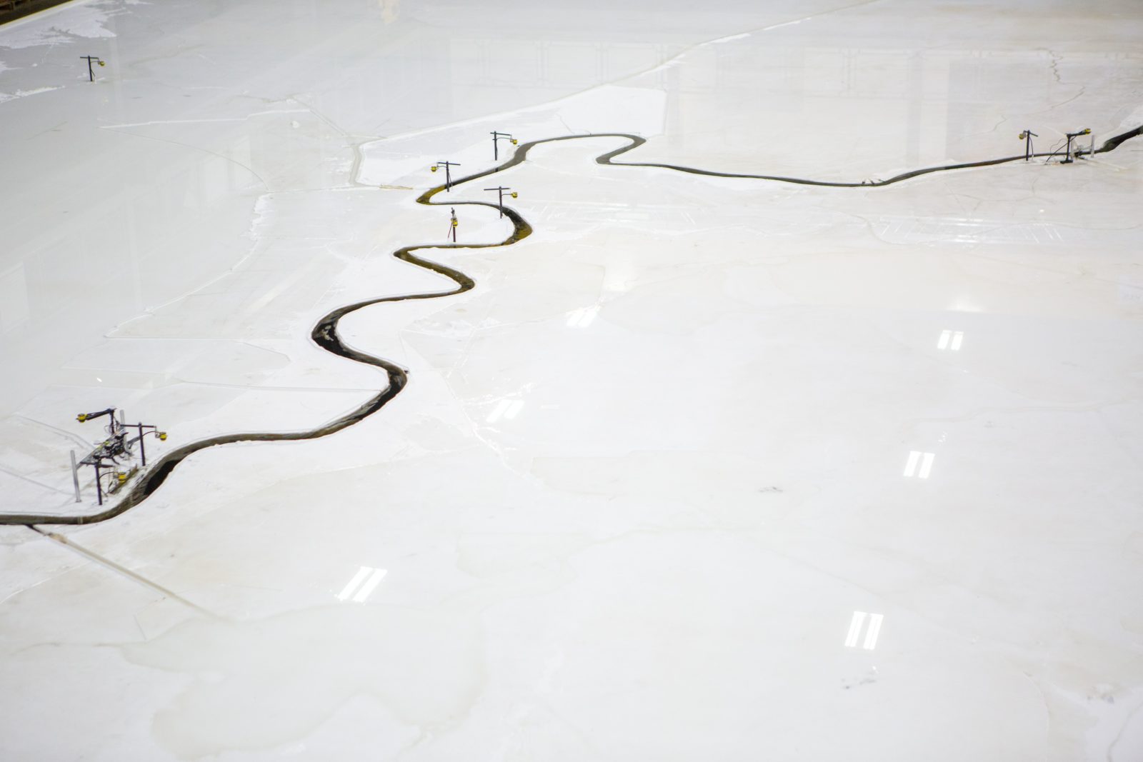Day two. Back in the bus. This time our destination was the productive heart of the region’s hydrocarbon industry: Baton Rouge. We were headed there thanks to the initiative of Catherine Russell, a sedimentologist who carries out research upriver from the city. Pulling cores of muddy sediment from the land, she tries to better understand the complex reciprocities that have taken place between the river, its sediment, and the geomorphology through which it flows. Once more heading out along the River Road, we arrived at the Louisiana State University (LSU) Center for River Studies, where professor Clinton Willson welcomed us into an information-packed visitor center. We were there to see what is perhaps the world’s largest working analog model of a river system. At ten thousand square feet, the table top model fills a space the size of a sports hall. Varying sediment loads can be simulated across its vast planar surface, which represents the Lower River, approximating the alteration to depositional processes caused by upriver hydroengineering. Like a giant battlefield diorama, the model is intended to allow for strategizing how to best manage the coastal subsidence. As we entered, research-student Godzillas scrambled off the model. A bombastic animated presentation was then projected onto the planar surface of the model, with a disembodied voice telling of inevitable land loss and controlled retreat, a narrative of control projected by the LSU River Studies Center on behalf of the Coastal Protection and Restoration Authority (CPRA).