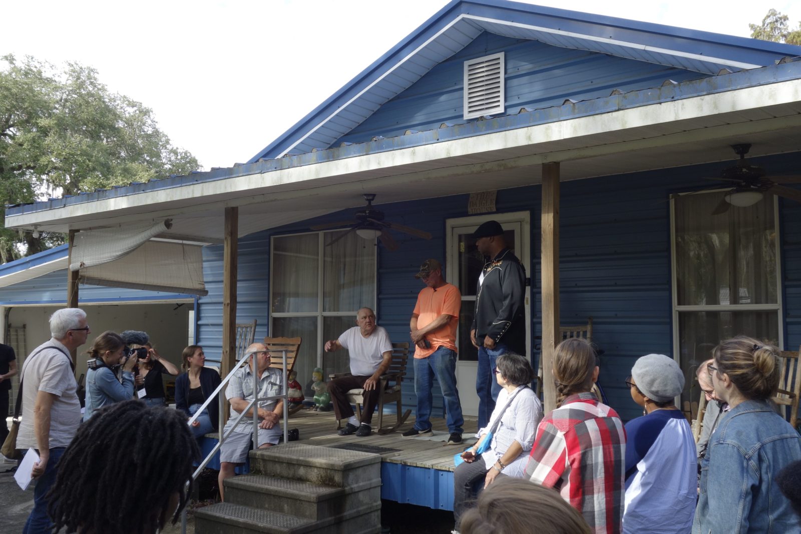 With considerable skill, our driver negotiated the narrow roads of the township of Pierre Part, in Assumption Parish. Our bus, scraped by the low-hanging branches of live oaks, came to a stop, and we poured out. It was an absurd entrance into this thick-aired site of backyard domesticity. Artists, academics, and concerned citizens from around the world had arrived at the home of a welcoming, if somewhat bemused, family. Thanks to Bruce, we were there by invitation. We were greeted by eighty-two-year-old fisherman Mr. Daigle, whose home it was, as well as his son Kevin and a cast of other family members and curious neighbors. The Diagles are Acadian, descendants of French-speaking people from Atlantic Canada who the British forcefully deported from that region in the 1700s.2 Mr. Diagles’ home is raised on blocks. It backs on to a dense swamp, a silty interconnection between a series of lakes from which subsistence and income have been derived for generations. Mr. Diagle, seemingly amused by our arrival, immediately won our crowd over by assuring us he was “not a Trump man.” Settled in his porch chair, he told us of the changes in the number and distribution of animals from which he had made his living: catfish, nutria (swamp rats), crawfish, turtles, and alligator. His great familiarity with the life cycles of these creatures and his firsthand experience of working this watery land have directly shown he and his family how changes in mean global temperature have affected their immediate environment and the prospects of deriving a living from it; put succinctly by Vivian, a resident of Pierre Part, “the seasons are messed up now.”