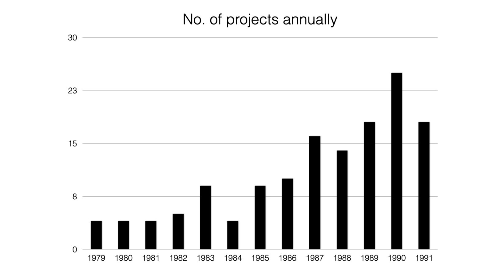 Figure 1. Number of projects conducted by the Swedish Space Corporation annually. The larger number of projects in 1983 comes from consulting a receiving station for remote-sensing data in Pakistan. The increase in projects from 1986 onward relates to the organization’s ability to showcase its mapping project in the Philippines to secure additional projects abroad. Courtesy the author