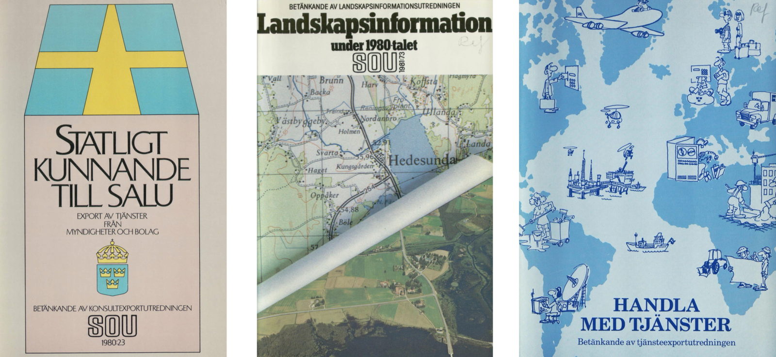 Figure 2. Betänkande av Konsultexportutredningen (Government inquiries), SOU 1980, vol. 23. Statligt kunnande till salu: Export av tjänster från myndigheter och bolag (Consultancy export inquiry. Government knowledge for sale: Exports of services from government agencies and companies); SOU 1981, vol. 73, Landskapsinformation under 1980-talet. Betänkande av landskapsinformationsutredningen (Landscape information during the 1980s. Report of the landscape information inquiry); and SOU 1984, vol. 33, Handla med tjänster. Betänkande av tjänsteexportutredningen (Trade with services. Report of the service export inquiry). Swedish Government Official Report Series (Statens offentliga utredningar)
