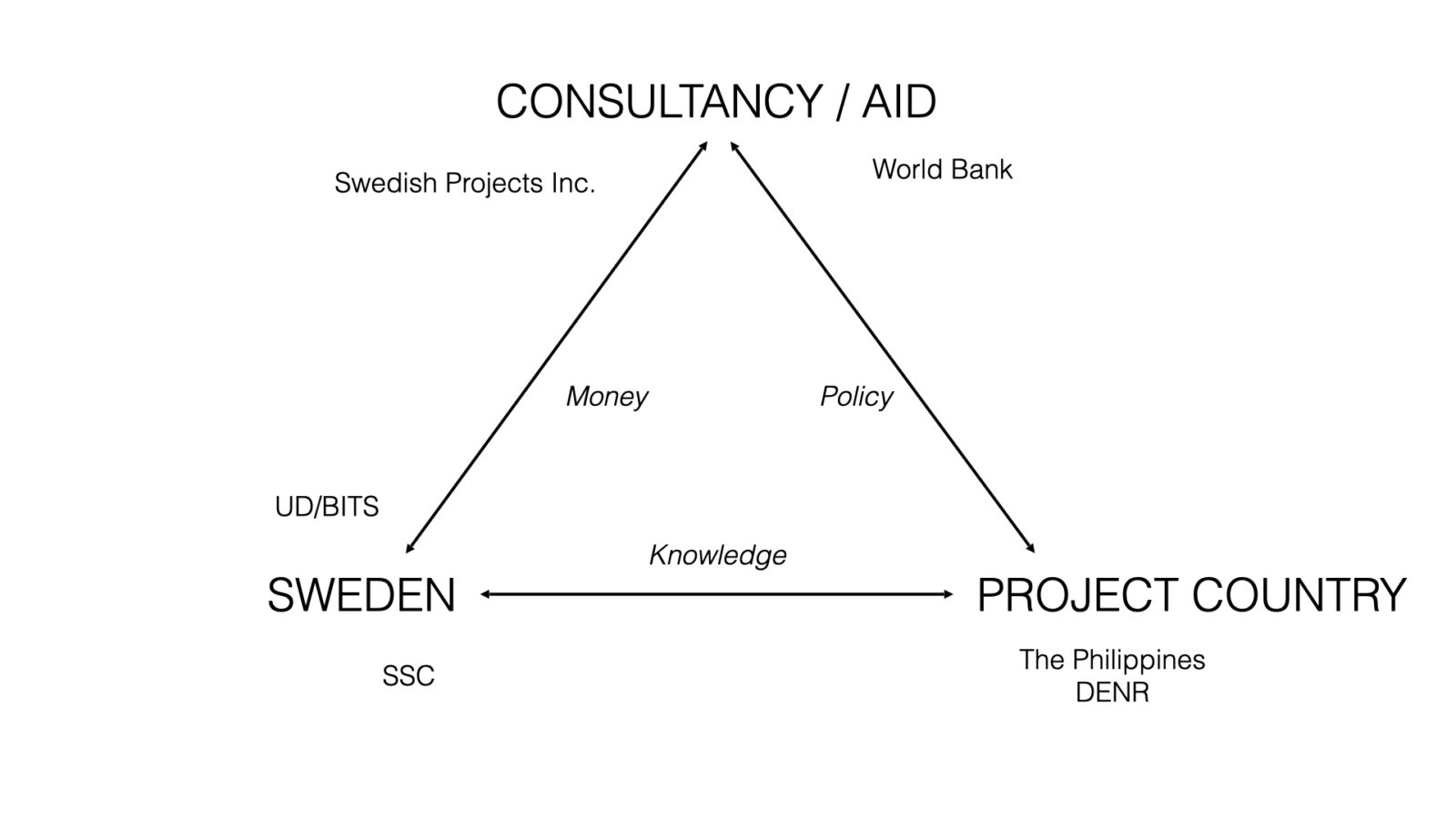 Figure 3. Aid Triangle. Abbreviations and acronyms: BITS: Swedish Commission for Technical Co-Operation; World Bank: International Bank for Reconstruction and Development; UD: Swedish Ministry of Foreign Affairs; DENR: Philippines Department of Environmental and Natural Resources. Courtesy the author
