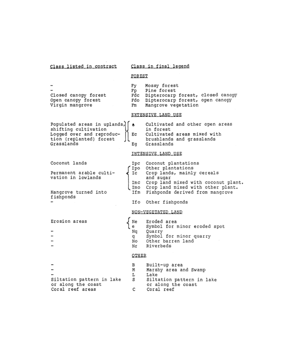 Figure 6. Differences between classes used in the contract and in the final legend for the mapping of the Philippines. Swedish Space Corporation, FSF101. Mapping of the Natural Conditions of the Philippines. Final Report, SSC Central Archive, Stockholm, p. 18, and FSF101. Annex B. Project Proposal for Mapping of the Natural Conditions in the Philippines, April 1987, F2B:208, BITS, Swedish National Archives, Arninge