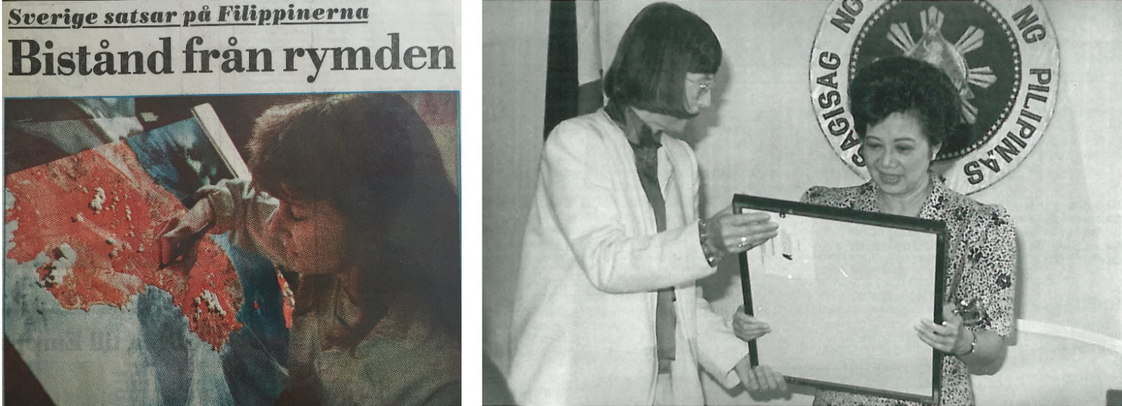 Figure 7. “Sweden supports the Philippines. Aid from Space,” headline in the Swedish newspaper Upsala Nya Tidning (left). Ceremonial handing over of the satellite map of the Philippines, from Swedish Minister of Environment Birgitta Dahl to President of the Philippines Corazon Aquino. © SSC, 1988