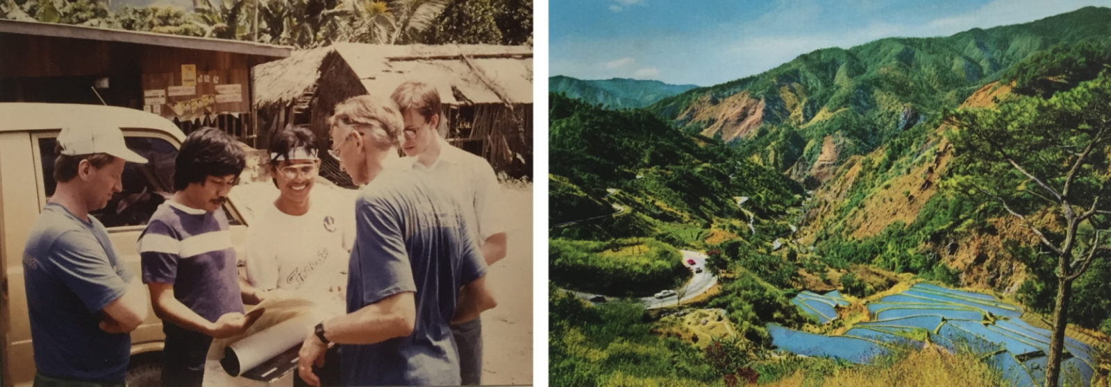 Figure 5. Fieldwork in the Philippines: Swedish remote-sensing experts and Filipino land surveyors review how SPOT scenes correspond to earlier regional maps (left). A photo postcard made during the fieldwork. © Hans Rasch. Private collections