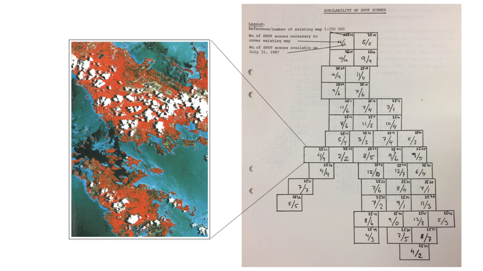Figure 4. A SPOT scene from the Philippines (left) and a sketch dividing up the Philippines into sections of scenes. “SPOT scene” describes organizing satellite data into images that depict a section of the Earth’s surface sixty kilometers long and sixty kilometers wide. The scenes were the raw resource that remote-sensing experts then molded through enhancement, interpretation, and classification, to yield further information for the end user. The number of scenes required to observe, for example, a region of land defined how costly such a project would be. © SSC, 1988. Illustration by the author
