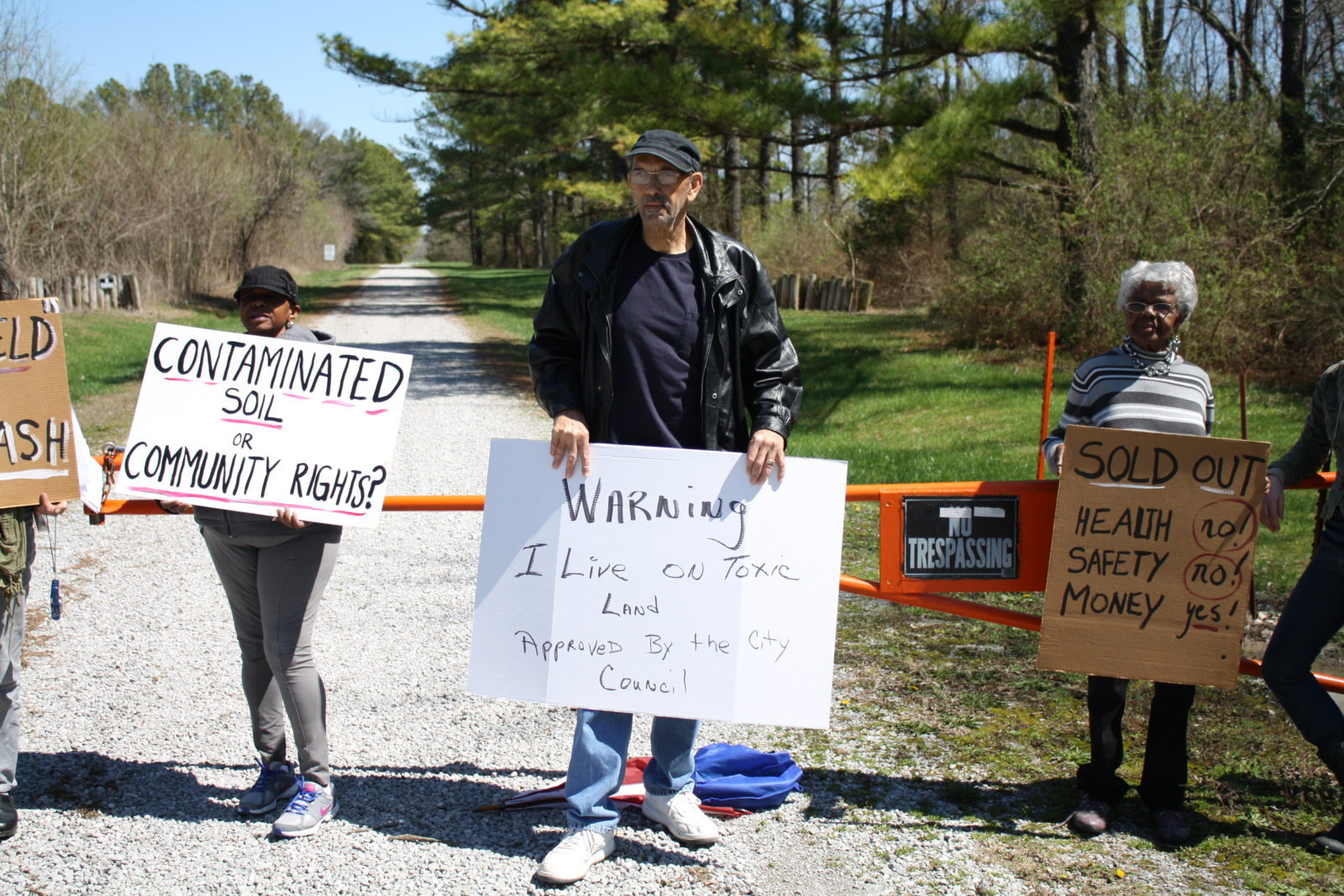 Members of Concerned Citizens of Carbondale protesting near the former Koppers wood treatment plant. The plant closed in 1991 but the effects of the toxins it left behind in the soil continue to be felt. Photograph by Pepper Holder