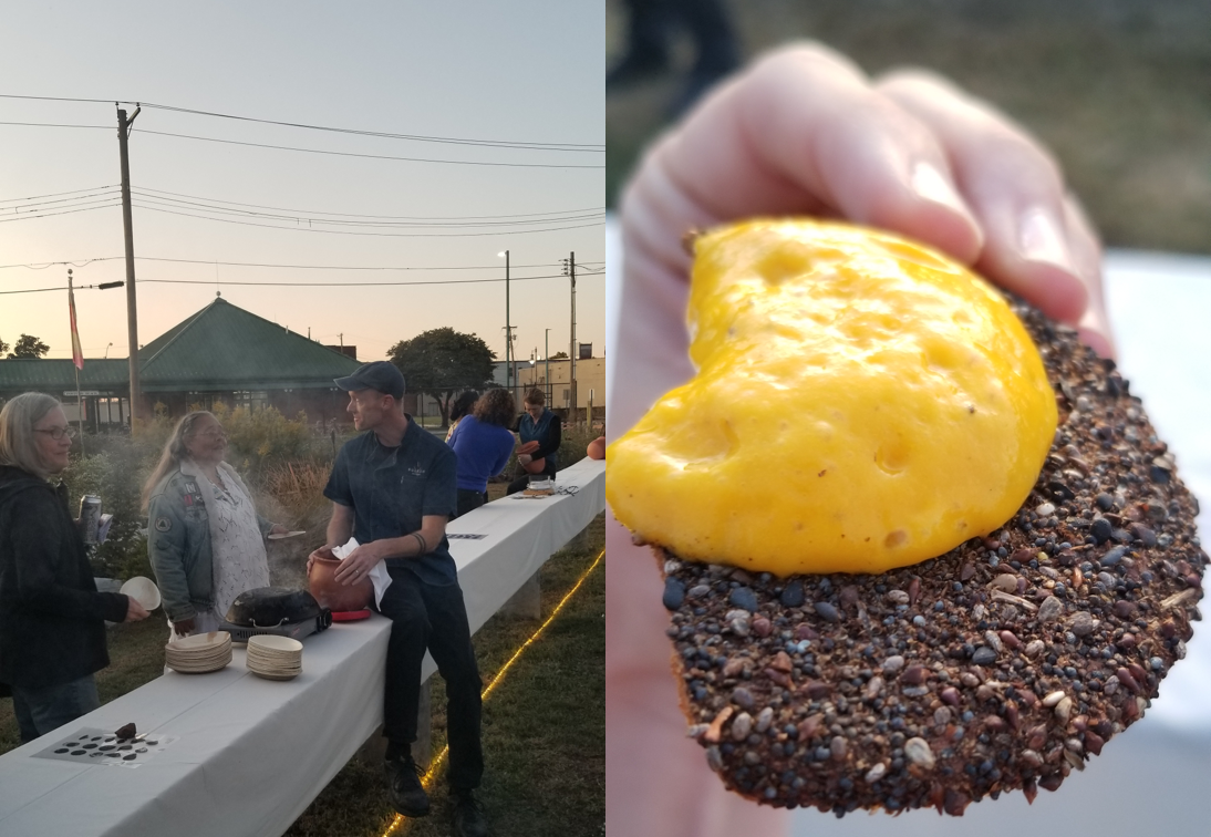 Chef Rob Connelly serving dishes made from lost crop seeds at the Granite City Arts District as part of the Anthropocene River Journey's Field Station 3 visit (left), and (right) one of the chef's creations, featuring erect knotweed seed crackers and squash mousse. Thanks to Rob Connelly and Lynn Peemoeller for making the Edible Narrative possible. Photo by Natalie G. Mueller.