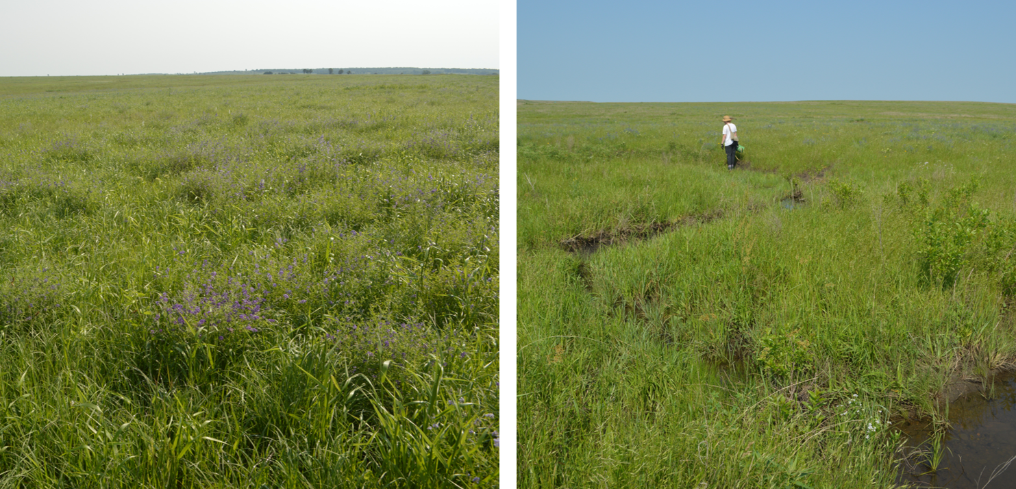 Tallgrass prairie in late spring with no bison trail to follow (left), versus following a bison trail from stream to stream (right). Photo by Natalie G. Mueller