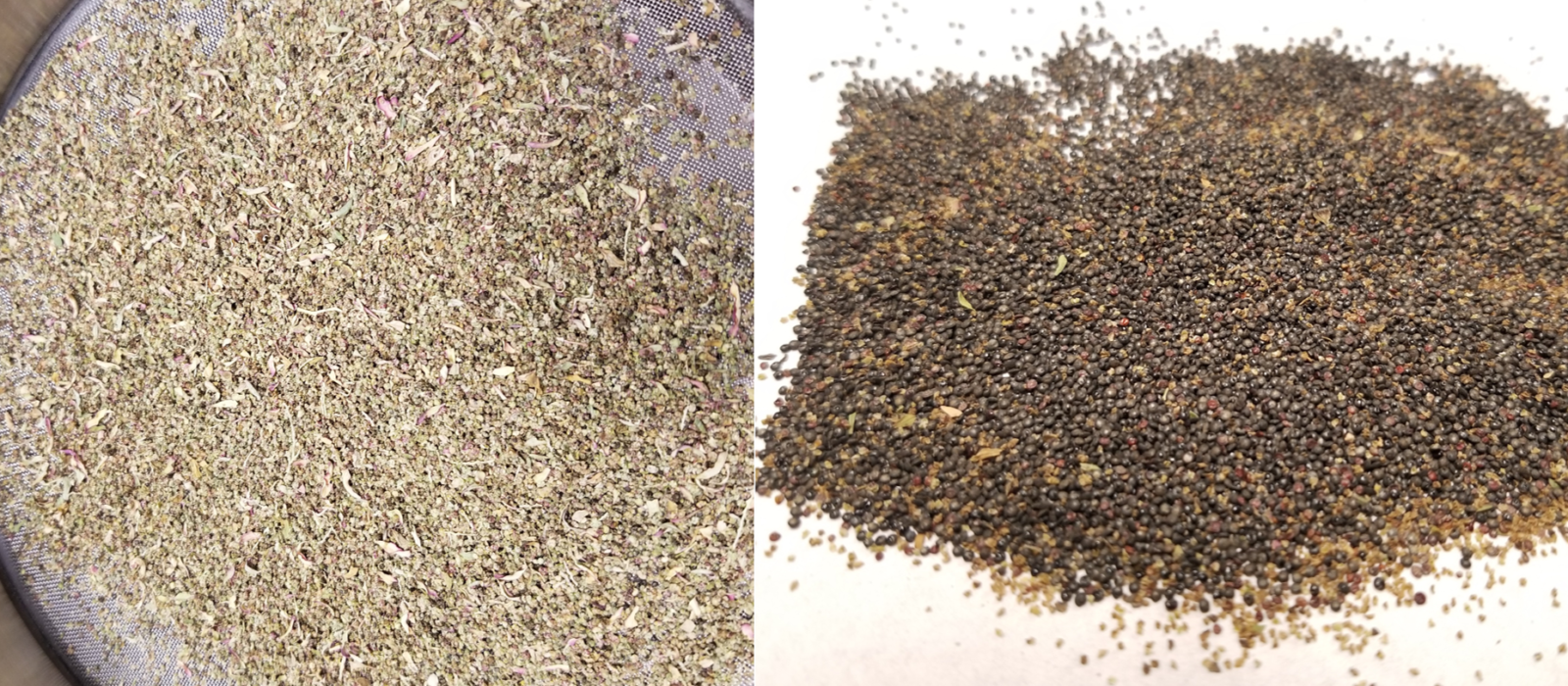 Before (left) and after (right) cleaning goosefoot seeds. In my experiments, this process takes about three times as long as harvesting. Photo by Natalie G. Mueller
