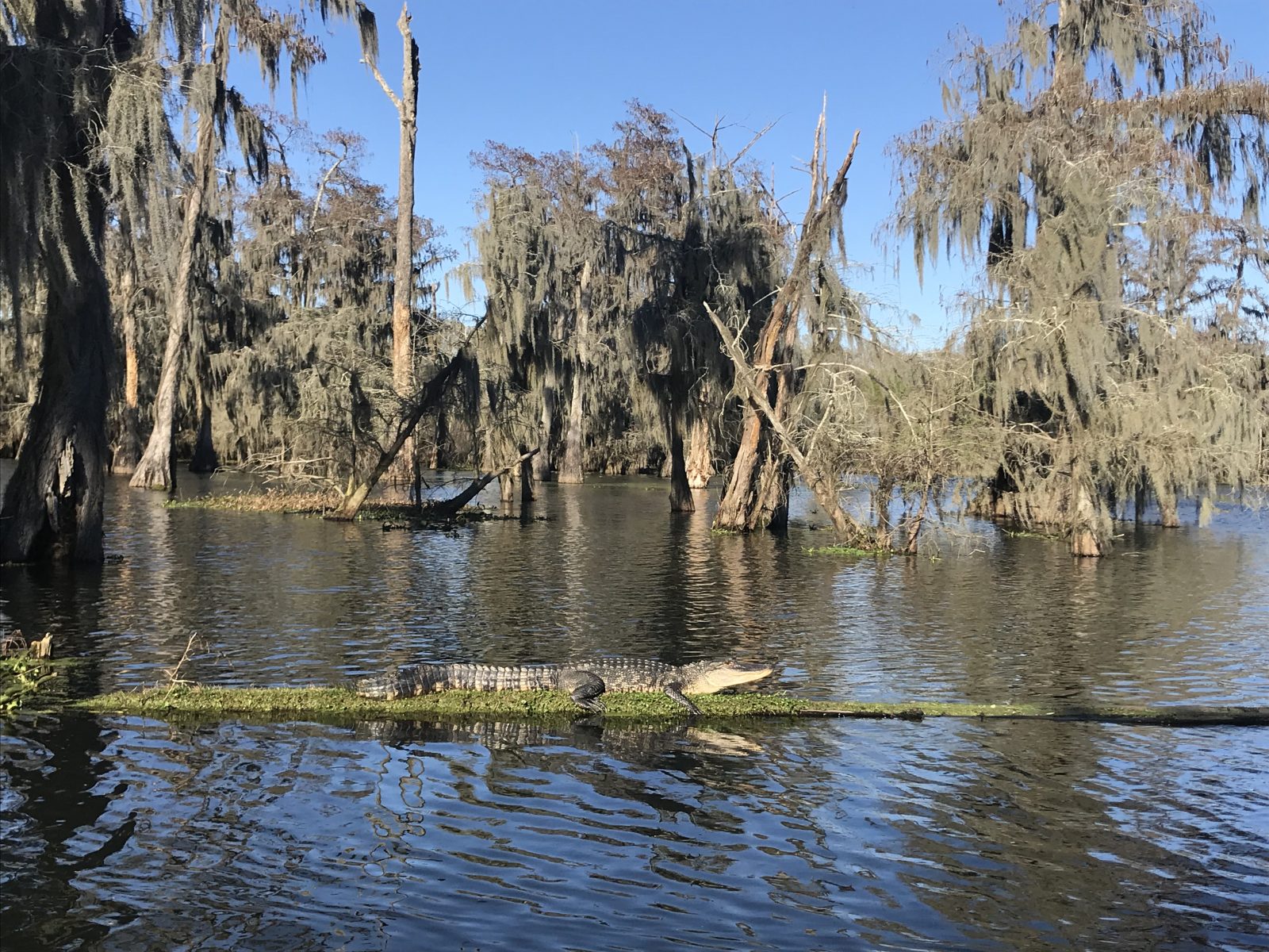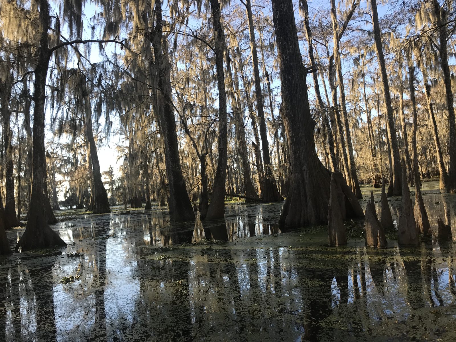 Catherine: The story that ushered me into my current work now to me seems to be a kind of trilogy of visits to the Delta region of Louisiana. I met a professor from Louisiana State University (LSU) at a conference in 2018, and we established a collaboration, so when I went to Baton Rouge in February 2019 to present a talk, we began working together on a paper. My first impression of Louisiana was the Dallas/Fort Worth airport, which is in Texas, but it has this giant mosaic on the terminal floor that depicts the meanders and landscape of the Mississippi River. The pride in, and importance of, the river is something that I became ever more aware of, and I remember pressing my face to the airplane window during my connecting flight to Baton Rouge, awaiting my first glimpse of the mighty Mississippi. It was dark when I flew over, so she was only visible through the absence of light. I had to wait to really see her.