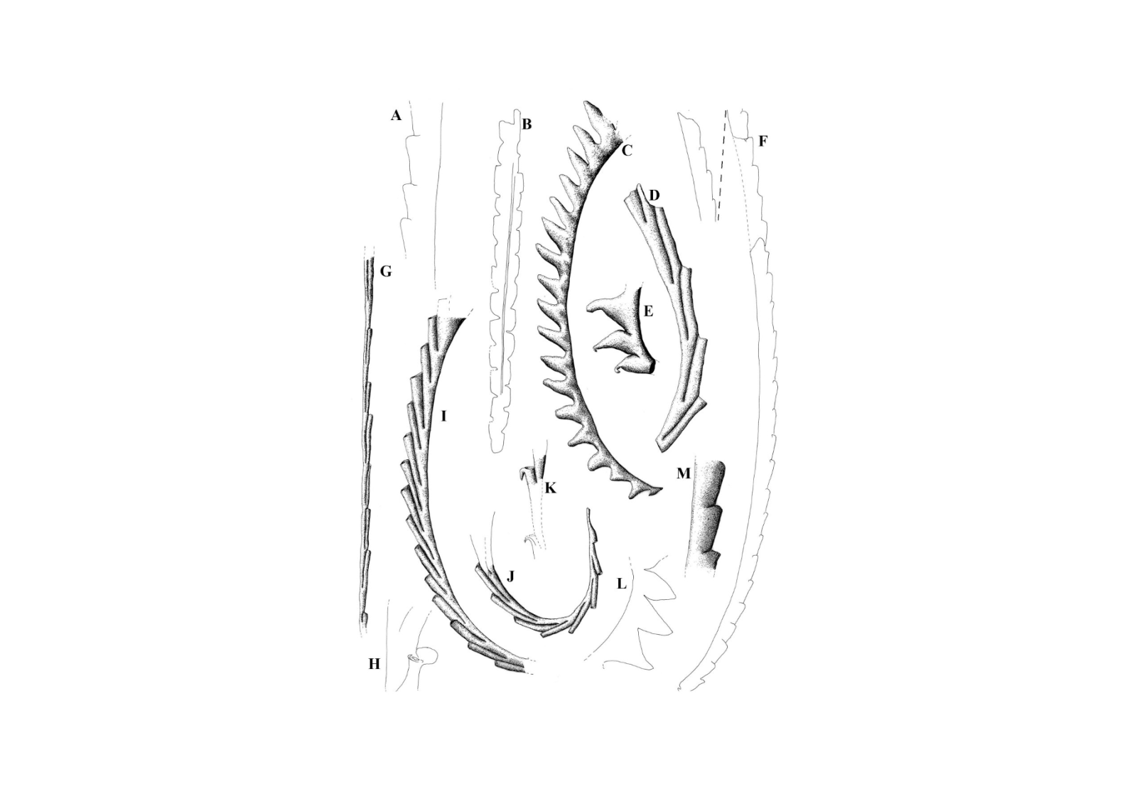 A collection of drawings of graptolites, small plankton now long extinct. Their shapes are used to unravel mysteries about stratigraphy and ancient ocean currents. For scale, B, C, F, G, I, and J are all to the same scale and B is 13 mm long. A, D, E, H, K, L, and M are all twice the scale. Drawing by Catherine Russell
