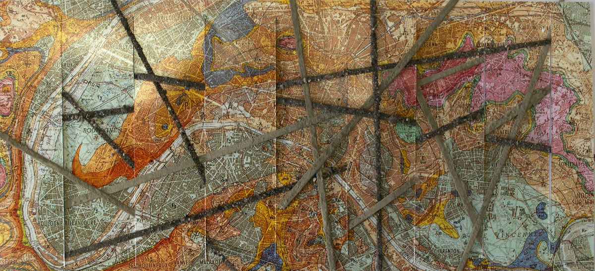 This is a current geological map of Paris, woven with translucent strips covered in either cement powder or a mix of anthropocenic earth taken from an old industrial site on the outskirts of Paris. The interweaving seen in the Mikado Sol is just like the interweaving of the Anthropocene. In precarious equilibrium, as in a game of pick-up sticks, anthropogenic soils and layers of concrete intertwine, as “human” and “natural,” now without any clear separating limit.