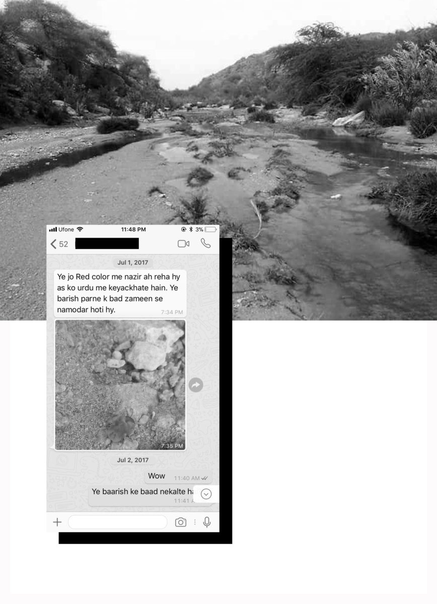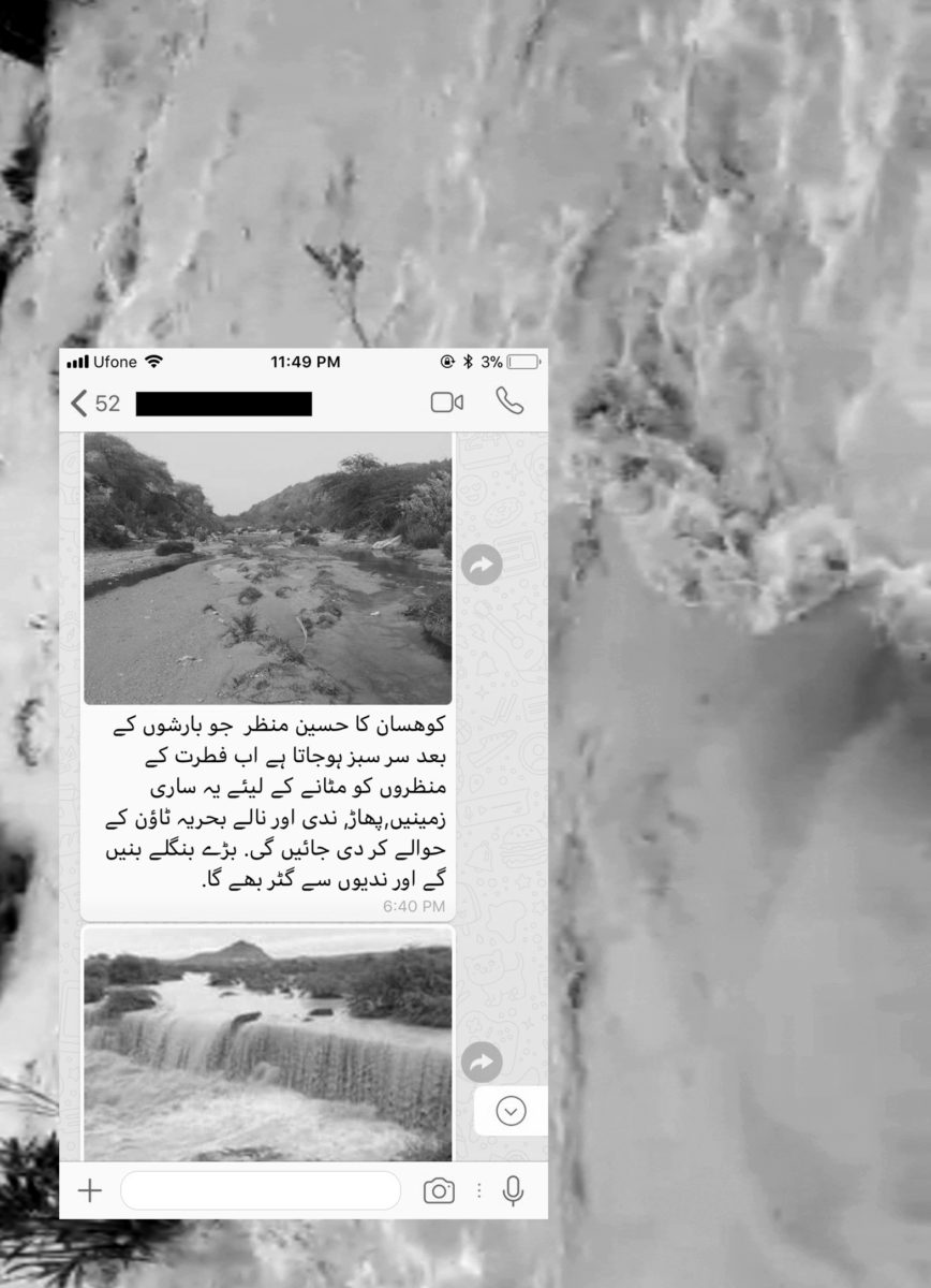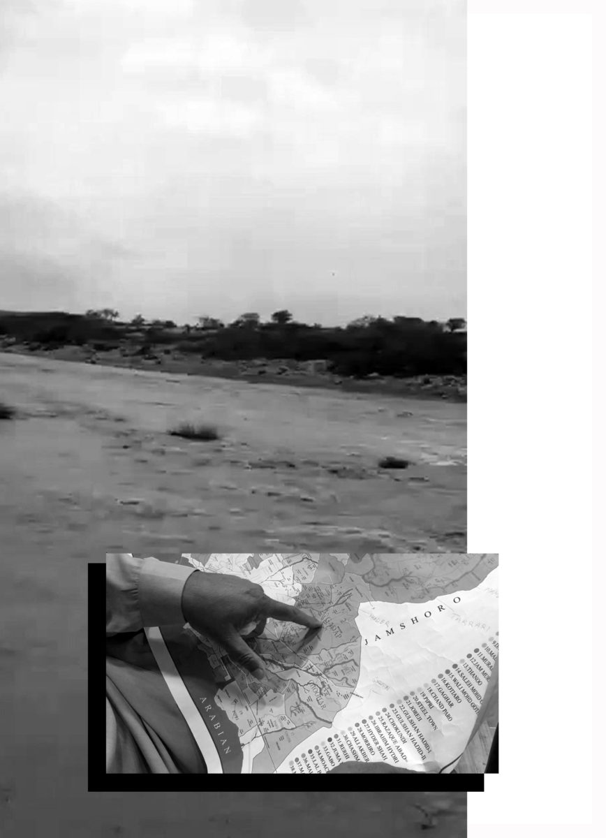 As we moved through this landscape, where development and infrastructure are unleashing vast dispossession and erasure, communities spoke of the dozens of seasonal rivers and waterways that exist here that are being wiped out and built upon. While Bahria Town advertisements and maps invoke Gadap as a barren wasteland awaiting the gift of development, local communities alerted us to the seasonal rivers and nourishing landscapes that have sustained life here for centuries. Roz, Kaccha, and Chakor are the Balochi names given to the streams and other places where water would collect after rains in the Pahwaro mountain of Gadap. Padaraii Chhab was another place on the mountain where every year after the rains, people from nearby villages would go live with their livestock. In Balochi, padar means “temporary,” and chhab means “a small waterway.” These placenames reflect the way people engage with and inhabit their land as well as the centrality of seasonal waterways in practices of migration and settlement. The names enable a remembering, an intergenerational sharing of knowledge and intimacy with the natural landscape. Since they are not visible to the eye, sensing these ephemeral rivers requires a familiarity with the forms and flows of the landscape and demands close attention to the textures of the ground—the silt and sand, pebbles and rocks—formed over centuries of intermittent contact with water. The residents of Gadap warned of the floods that await Bahria Town if its developers build into the land with little care or knowledge of this landscape—a warning that proves prescient across Karachi every monsoon, as we experience devastating floods in sites that were once rivers and now are concrete.