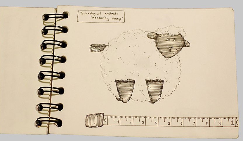 My measuring sheep lends some form to my thoughts about the Anthropocene. The Anthropocene is a big word that is generating many others. It makes me feel a little tired. This measuring tape is the product of greater technological developments, as well as of standardization—standardization that simultaneously enables collaboration, trade, and communication, and feeds into global hegemony and the loss of diversity. Given its material composition, it will outlast me. However, drawing the imagined future of a measuring sheep helps me scale down in time and space; from the caveman’s fire, the steam engine, or nuclear physics, to what my hand holds here and now. And it is in the here and now that I can think, act, and knit a few more rows.