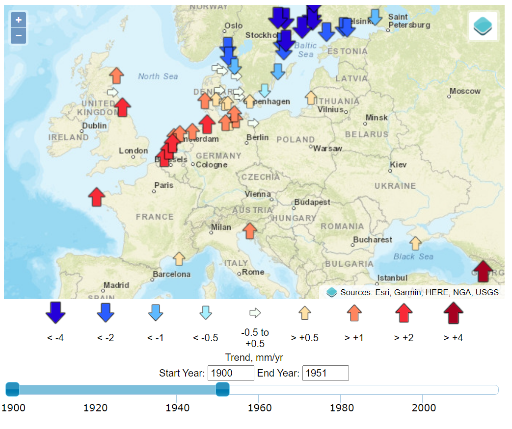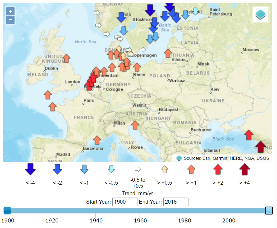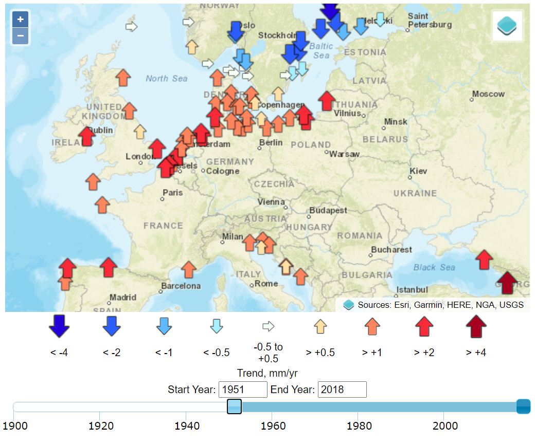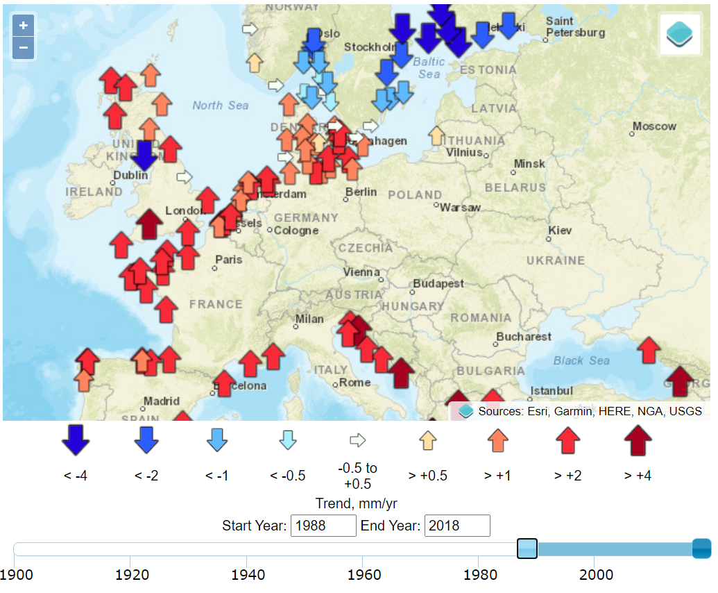 The timing of the measured sea-level inflections matches, with a delay of about a decade, the stepped changes in atmospheric carbon dioxide concentrations.7 Additional noise in the time domain of the calculated global mean trends of sea level is observed to coincide with volcanic eruptions (negative deviations) and the 2016 Super El Niño and 2011 La Niña events (positive and negative deviations, respectively), as can be seen in the Global Mean Sea Level chart provided by the University of Colorado. Other processes, such as ocean dynamics, tectonics, or glacial isostatic adjustment are spatially variable and cause sea-level rise to vary (usually very slowly) in rate and magnitude between different regions. Local and regional changes in these climatic and geophysical factors produce significant deviations from a global average rate of sea-level change.8 These dynamics are well illustrated by the interactive graphics at the Permanent Service for Mean Sea Level (PSMSL) based at the National Oceanography Centre in Liverpool.