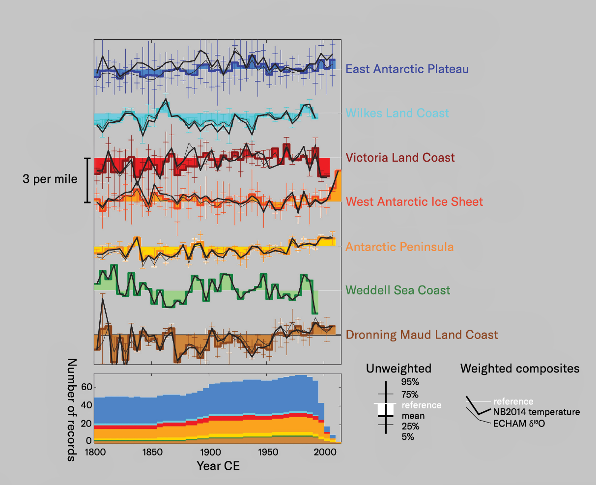 The in recent decades does, however, lead to . Hydrogen isotopes show covariation with oxygen and with temperature, so measuring both elements provide a more robust measure of past temperatures. To avoid local effects, the most reliable signals are reached through the combination of multiple ice-core records from a given site and/or region, and through the site-specific calibration of the relationships between water-stable isotopes and temperature ,9 which has been carried out under an international project identifying several discrete regions of Antarctica that exhibit somewhat different climate signals (see below). Temperature reconstructions based on the isotopic data showed warming in recent years in three of these regions. In each case the began around 1920 and continued to the latest available measurements (ca. 2005) with rates of warming between 1 and 2°C/100 years. These increases followed that lasted over the previous 2,000 years. However, relative to the for the past 2,000 years, only the rise in temperature of the Antarctic Peninsula is unusual. It seems reasonable to assume that because of its more northerly aspect, the Peninsula is subject to a slightly different climatic regime than most of the continent, and one that is closely connected to the global warming identified elsewhere on the planet. Close inspection of the isotopic temperature signal for the Peninsula suggests after about 1970 than between 1920 and 1970, much as is found in the global surface temperature signal. It seems likely, then, that the Peninsula temperature signal reflects after 1900, followed by after 1970, as on the rest of the globe.