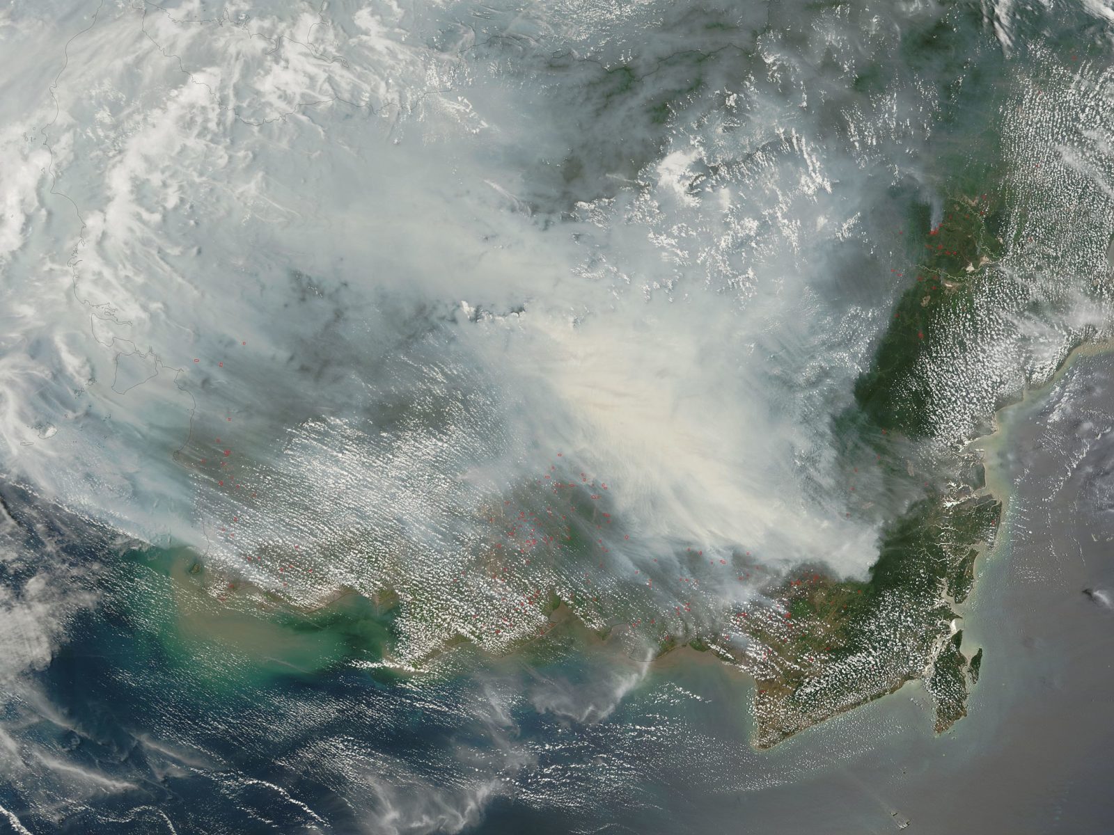 In Southeast Asia, a massive haze problem has flared up in various degrees every year since the late twentieth century. In 1997, the annual haze brought this part of the Asian continent to the edge of environmental catastrophe. It originated from forest and peat (a layer of soil with partially decayed vegetation or organic matter) fires during the inter-monsoonal dry season in Kalimantan and Sumatra in Indonesia, which released the equivalent of roughly 15 percent of the year’s average global carbon emissions from fossil fuels into the Indonesian atmosphere. Clouds of smoke spanned three million square kilometers, affecting parts of Malaysia, Singapore, Brunei, Thailand, and Philippines in the north and reaching Sri Lanka in the west. The widespread destruction of land and forest, which could have otherwise been used for agriculture, resulted in massive economic, social, and environmental damage.