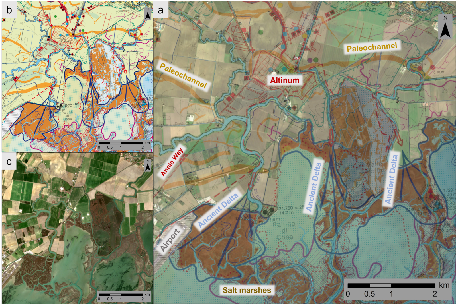Geomorphological map superimposed on the satellite imagery. Intense anthropogenic interferences on the geosphere are evidenced, the ancient ones (Altinum, Annia way, and the river diversions) as well more recent ones (Venice Airport). Note that ancient morphologies such as river paleo-channels and fluvial deltas (currently salt marshes) extensively characterize the Venetian area. Map courtesy of Geomorphological map of the Province of Venice, scale 1:50000, ed. A. Bondesan, M. Meneghel, R. Rosselli, A. Vitturi, Florence: Lac, 2004; Satellite imagery from Copernicus Sentinel data, March 2021