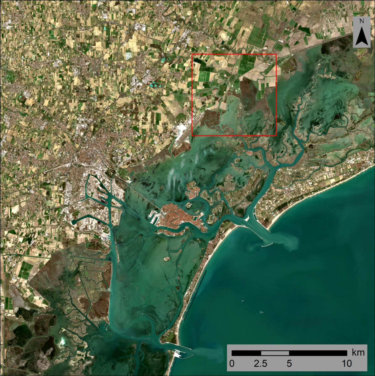Venice’s archeosphere. An overview of the lagoon of Venice with the area of the Roman city of Altinum highlighted in red. Satellite imagery from ESA-Copernicus Sentinel 2 sensor, Copernicus Sentinel data, March 2021,