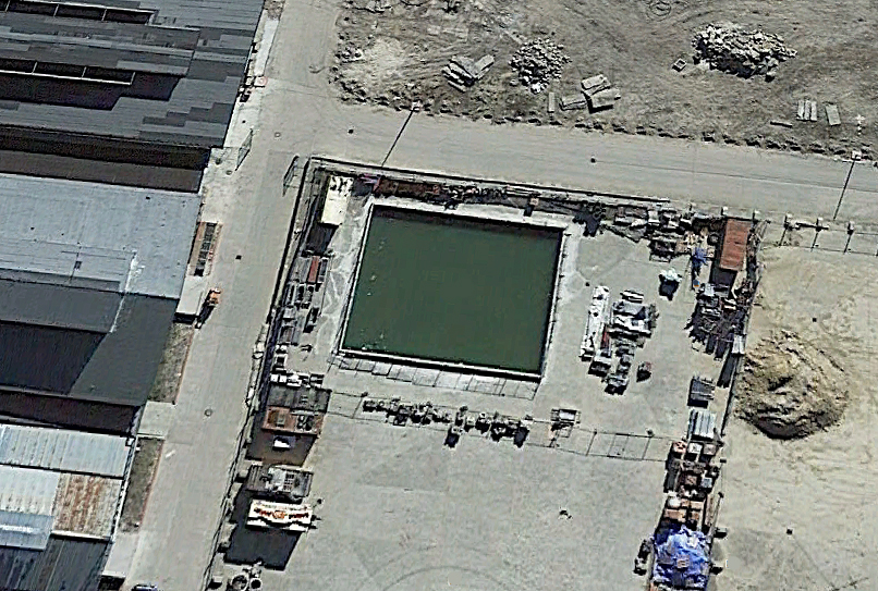 In order to sell land parcels belonging to the site, the owner was obliged to construct a reservoir to act in accordance with fire-safety regulations. The giant pool subsequently constructed is affectionately and somewhat ironically known to locals as the “swimming pool” (see image below). Some of the soil removed for the realization of the reservoir was used to construct a small hill on which grass seed has been grown; the vision is to one day have goats grazing on it. The remaining soil became the basis of a huge platform of around 60 cm high. This giant sarcophagus, the size of a tennis court, finally furnished with a number of street lamps, may become an ice-skating rink in the future.
