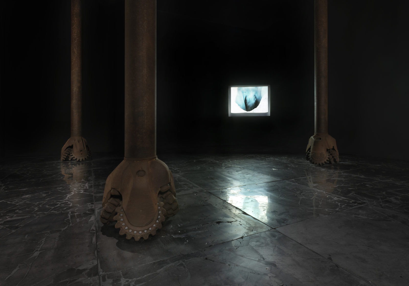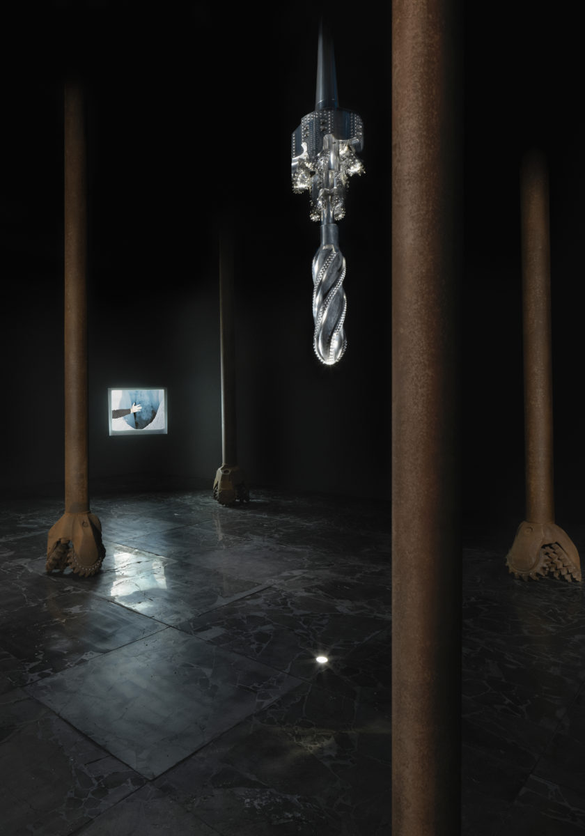 Weight of Shadows, 2021, installation view, Weight of Shadows, Prix Marcel Duchamp, Centre Pompidou, Paris, France, 2021. Weight of Shadows is an exhibition revolving around the video work, Pure Waste, displayed at Centre Pompidou, Paris, as part of its nomination for the Prix Marcel Duchamp in October 2021. The installations are dark and disorientating, seemingly floating in a space dominated by a reflecting floor, clad in polished anthracite coal, reflecting the ceiling to reinforce the intercourse between ground and sky. Time seems to stand still, with giant, rusty and discarded oil drill bits appearing in the room like ancient columns. One hangs above us—a drill bit rendered swordlike with diamond upon its tip. These gemstones have been produced by a vaporization process turning CO2—isolated from a mixture of ambient air from above the arctic ice caps, as well as human respiration—into diamonds. A light paper screen hovering in the back of the room shows the video work Pure Waste. Photo by Jens Ziehe. Julian Charrière, VG Bild-Kunst, Bonn, Germany © all rights reserved Weight of Shadows, 2021, installation view, Weight of Shadows, Prix Marcel Duchamp, Centre Pompidou, Paris, France, 2021. Photo by Jens Ziehe. Julian Charrière, VG Bild-Kunst, Bonn, Germany © all rights reserved